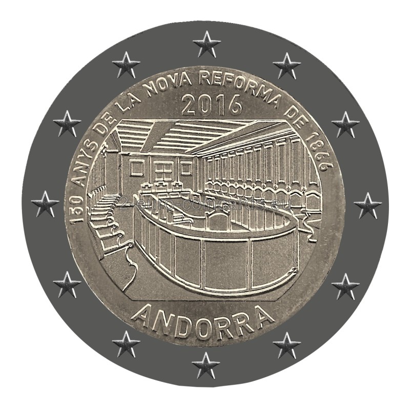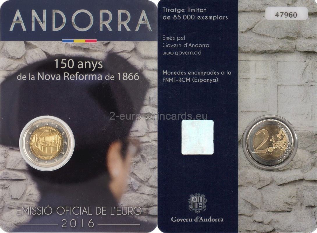 Vzor zobrazuje hlavnú miestnosť v „Casa de la Vall“ (priestory andorrského parlamentu) a zahŕňa nápis „150 ANYS DE LA NOVA REFORMA DE 1866“, rok vydania „2016“ a názov vydávajúceho štátu „ANDORRA“. Táto pamätná minca oslavuje 150 rokov od vydania dekrétu o Novej reforme, jedného z najväčších krokov v histórii Andorry a andorrského parlamentu Consell General, ktorý predstavoval spoločenskú a politickú transformáciu Andorrského kniežatstva.