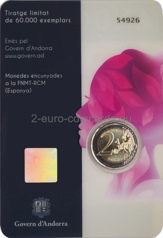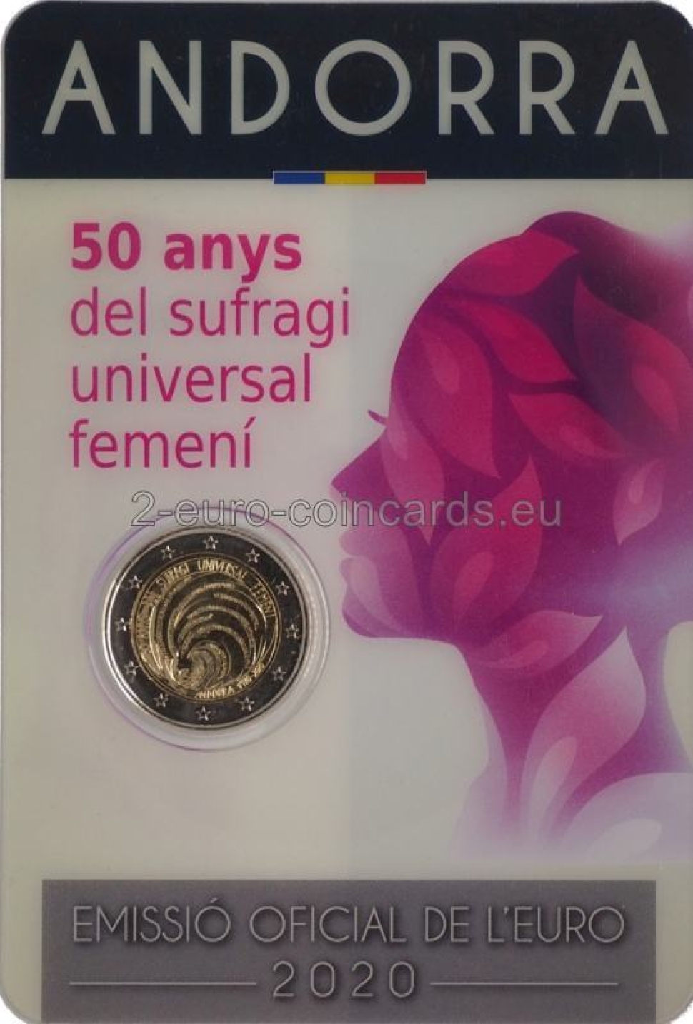 Na minci je vyobrazená ženská tvár, okolo ktorej sa točí spleť čiar. Tieto čiary sú tvorené ženskými menami v katalánčine, ktoré sú umiestnené tesne jedno vedľa druhého, a dajú sa preto len ťažko rozoznať, čo znázorňuje poctu solidarite žien v boji za ich práva. Opakuje sa len jedno meno, „VICTORIA“, ktoré symbolizuje víťazstvo v boji za získanie volebného práva. Vzor dopĺňa nápis „50 ANYS DEL SUFRAGI UNIVERSAL FEMENÍ“ (50 rokov všeobecného volebného práva pre ženy) a „ANDORRA 1970 – 2020“. Tieto nápisy sú takisto súčasťou spleti točiacich sa čiar, čím sa zdôrazňuje význam pripomínaného výročia.