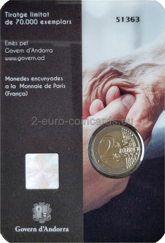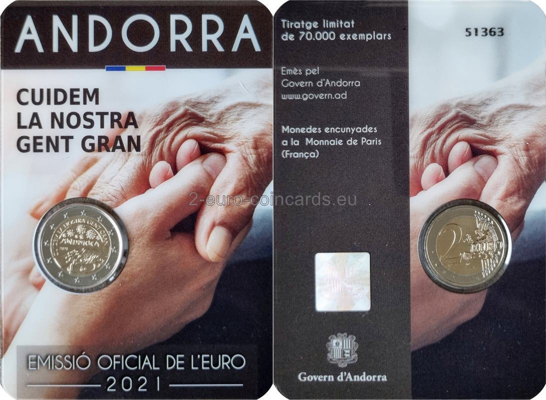 Motív mince „CUIDEM LA NOSTRA GENT GRAN“ (staráme sa o našich seniorov) symbolizuje vyobrazenie ruky mladého človeka, ktorý drží inú ruku vykazujúcu všetky známky starnutia, a pod nimi sa nachádza stetoskop. Názov vydávajúcej krajiny „ANDORRA“ obklopený niekoľkými vyobrazeniami vírusu SARS-CoV-2 predstavuje záväzok štátu zabrániť jeho šíreniu a starať sa o svojich obyvateľov. Na minci je uvedený aj dátum vydania „2021“.