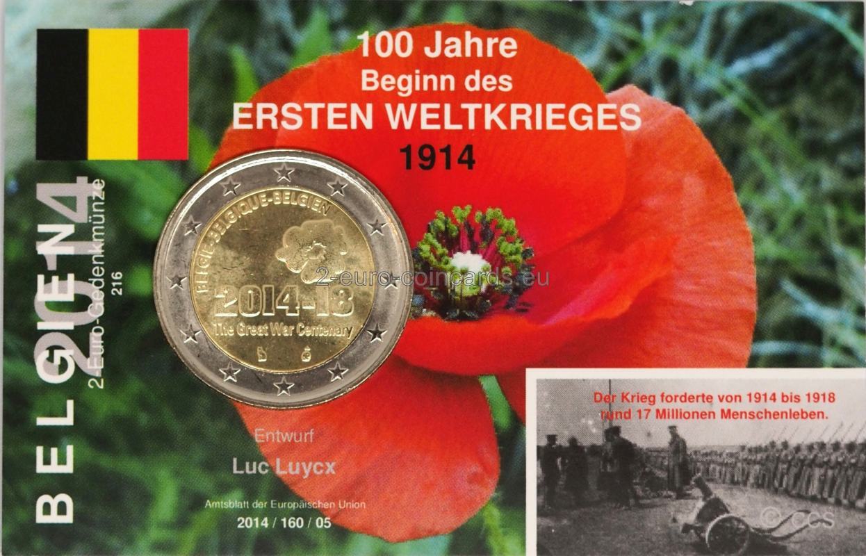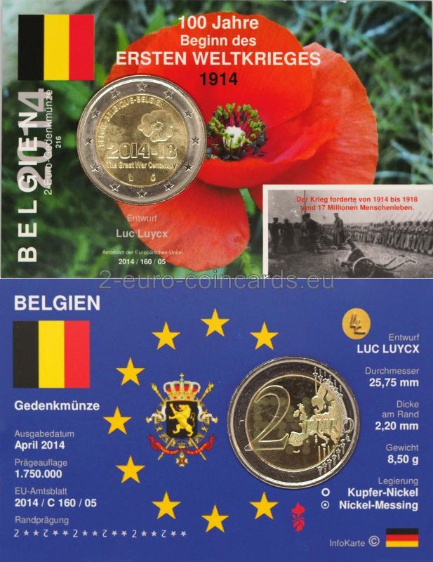 Na tejto pamätnej minci je oficiálne logo stého výročia Veľkej vojny: mak s pamätným dátumom. Maky sa stali symbolom prvej svetovej vojny, pretože hojne kvitli na bojiskách vo Flámsku, ktoré bolo zničené početným bombardovaním. Samotný mak je tiež plný symboliky: okvetné lístky sú červené ako krv padlých, a čierny vnútrajšok je ako farba smútku.