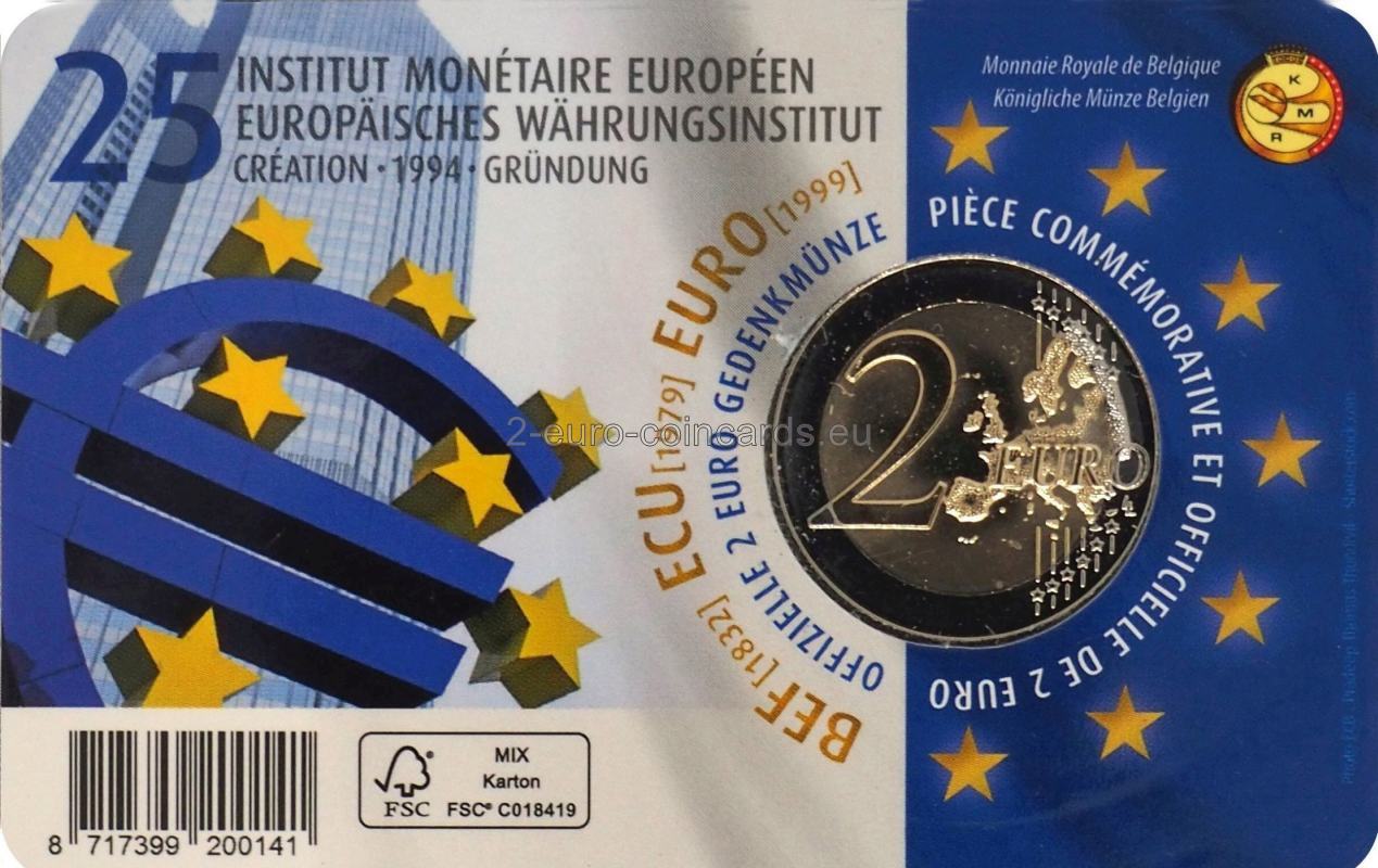 Vo vnútornej časti mince je na pravej strane vyobrazený portrét prvého prezidenta EMI Alexandra Lamfalussyho, pod ktorým je uvedené jeho meno. Na ľavej strane sa uprostred nachádza skratka EMI a nad ňou rok 1994, kedy bol založený inštitút a Lamfalussy sa stal jeho prvým prezidentom. Pod nápisom „EMI“ je vyobrazených niekoľko mincí padajúcich jedna na druhú, na ktorých sa v smere zhora nadol nachádzajú nápisy „€“, „ECU“ a „BEF“ (skratku bývalej belgickej národnej meny). Vzor má symbolizovať prechod od národných mien k jednotnej európskej mene euro, keďže EMI sa sústreďovalo predovšetkým na vytvorenie Európskeho systému centrálnych bánk vrátane ECB a novej meny. V hornej časti mince je vľavo umiestnený nápis „European Monetary Institute“. Na ľavej strane sa nachádza značka Kráľovskej holandskej mincovne v Utrechte (Merkúrova palica), a značka riaditeľky belgickej mincovne Ingrid van Herzele (erb mesta Herzele). V spodnej časti je umiestnený kód krajiny BE a označenie roka 2019. Napravo sú vpísané iniciály autora mince Luca Luycxa (LL).