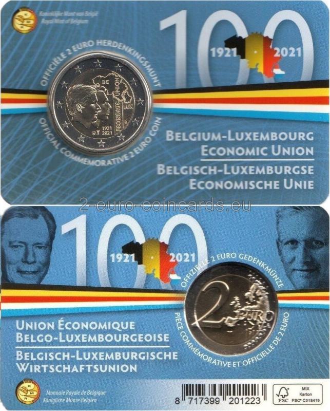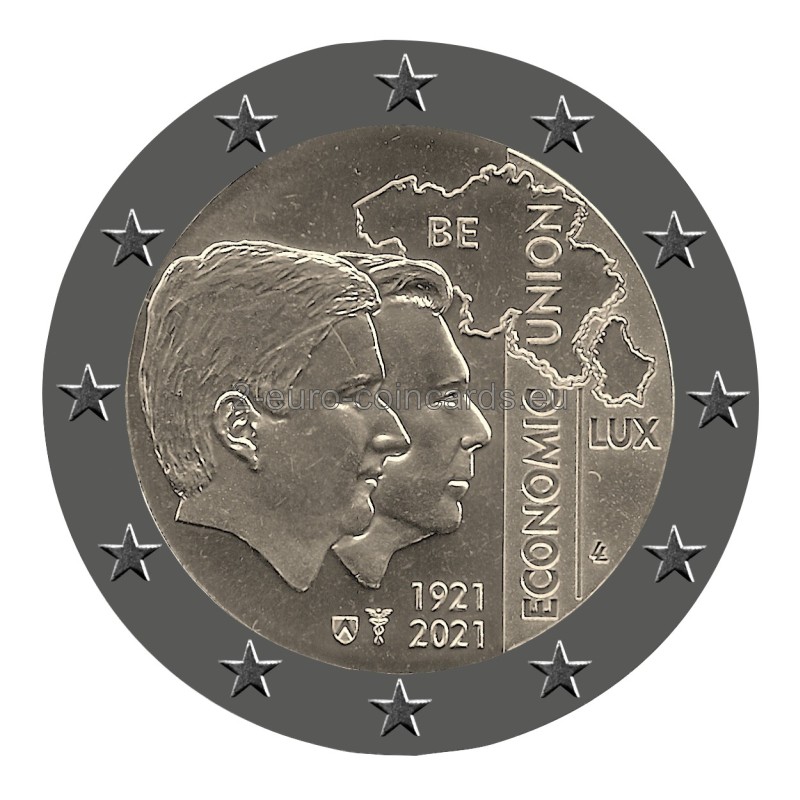 Na národnej strane mince sa nachádza podobizeň belgického kráľa Filipa I. a luxemburského veľkovojvodu Henriho. Okrem toho sú na minci vyobrazené obe krajiny a uvádza sa na nej názov „ECONOMIC UNION“ (hospodárska únia) a roky 1921 a 2021. V dolnej časti mince sa nachádza značka Kráľovskej holandskej mincovne v Utrechte (Merkúrova palica), ako aj značka riaditeľky belgickej mincovne Ingrid van Herzele (erb mesta Herzele). Na minci sa nachádzajú aj iniciály autora mince Luca Luycxa (LL).