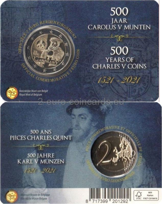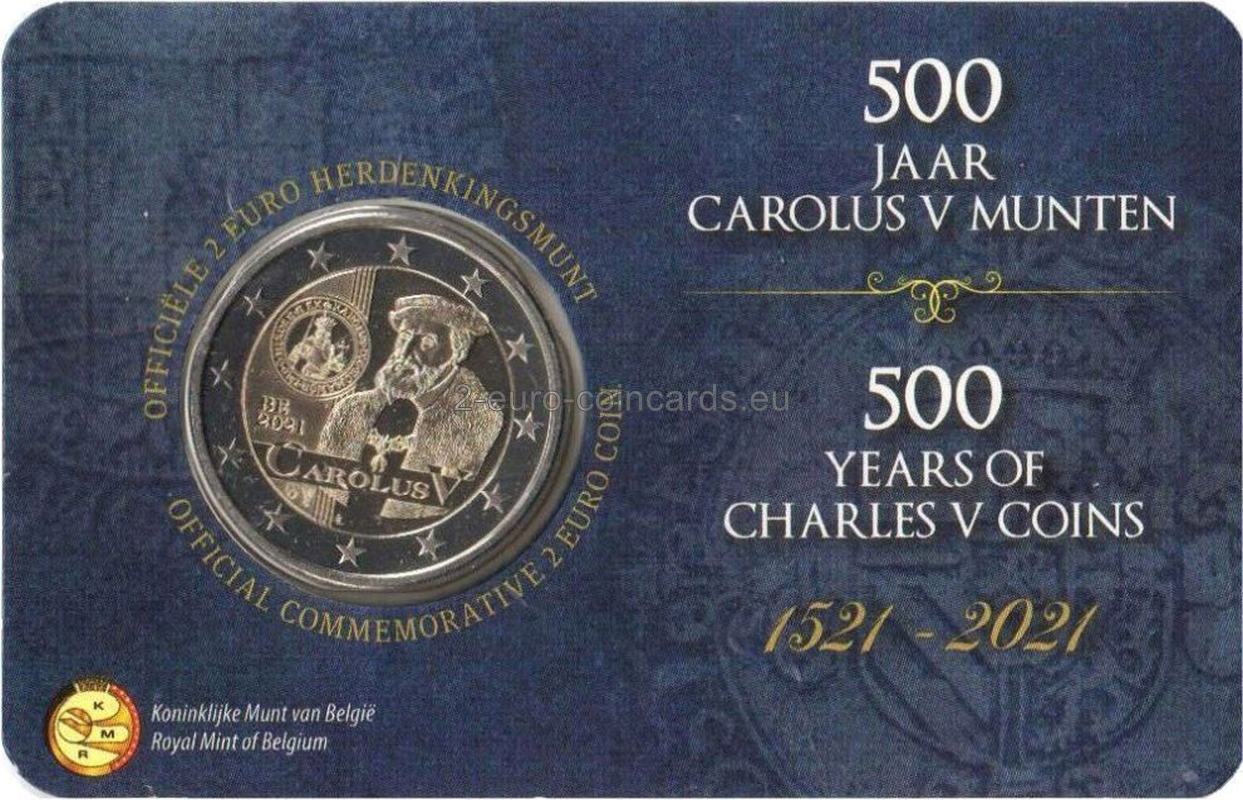 Vo vnútornej časti národnej strany mince je vyobrazený portrét Karola V. spolu s textom „Carolus V“. Naľavo je vyobrazený 500-ročný zlatý gulden Carolus, ktorý sa začal raziť po výnose o vydaní druhej série mincí za vlády Karola V. v dolnej časti mince sa nachádza značka Kráľovskej holandskej mincovne v Utrechte (Merkúrova palica), ako aj značka riaditeľky belgickej mincovne Ingrid van Herzele (erb mesta Herzele). Na minci sa nachádzajú aj iniciály autora mince Luca Luycxa (LL). V ľavej časti je umiestnený kód krajiny BE a letopočet 2021.