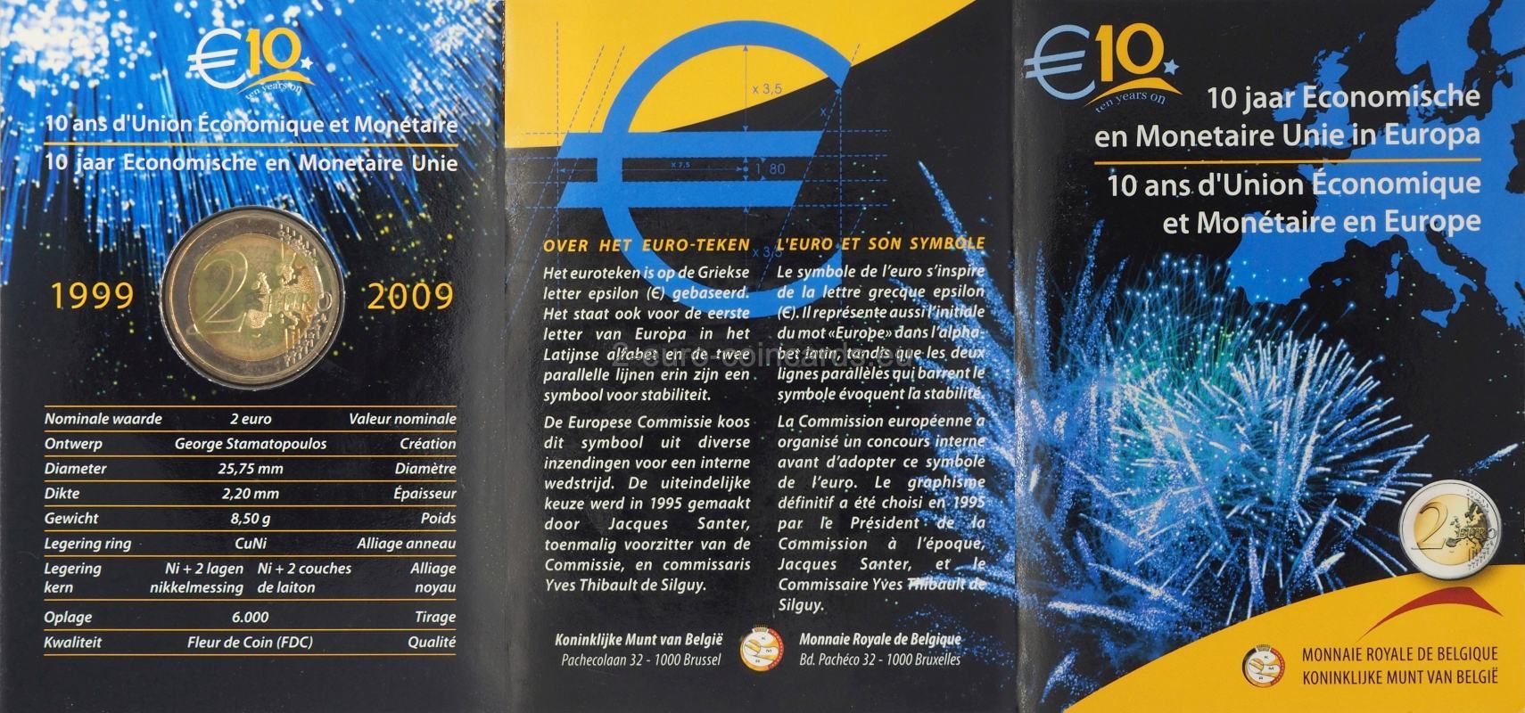 V strednej časť mince je zobrazená štylizovaná ľudská postava, ktorej ľavá ruka je predĺžená do symbolu meny euro. Pod symbolom eura sa nachádzajú iniciálky umelca „ΓΣ“. Názov vydávajúcej krajiny BELGIE BELGIQUE BELGIEN sa nachádza nad výtvarným motívom, pričom označenie rokov 1999 – 2009 a akronym EMU je pod týmto motívom. Po stranách vnútorného disku sú značky riaditeľa belgickej mincovne Romaina Coenena (váhy) a vpravo belgickej kráľovskej mincovne (hlava archanjela Michaela).