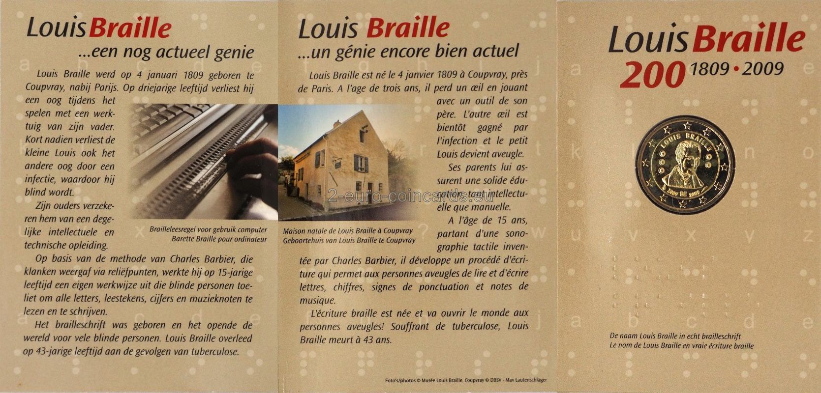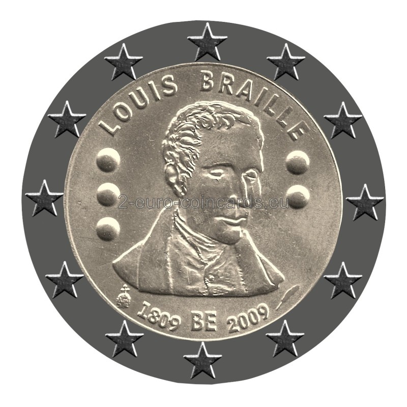 Na vnútornej časti mince je vyobrazená podobizeň Louisa Braillea, vynálezcu slepeckého písma, umiestnená medzi jeho iniciály L a B napísané písmom, ktoré vytvoril. Nad podobizňou je nápis „LOUIS BRAILLE“ a pod ňou je medzi rokmi 1809 a 2009 uvedená skratka vydávajúcej krajiny „BE“. Naľavo sa nachádza značka belgickej mincovne (hlava archanjela Michaela) a napravo značka riaditeľa mincovne Serge Lesensa (husie brko).