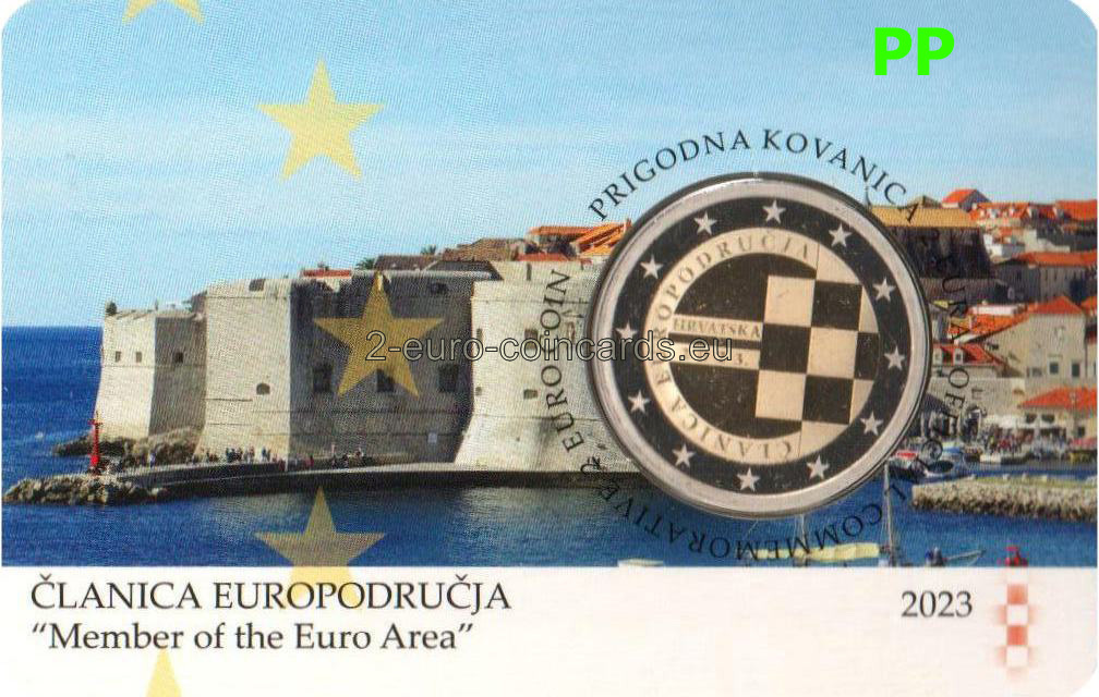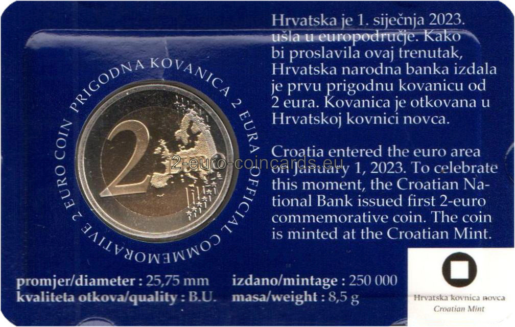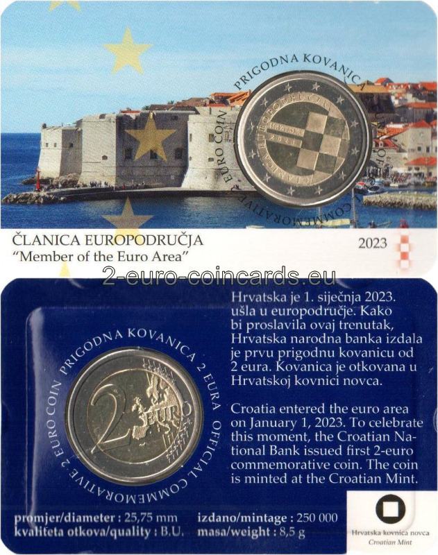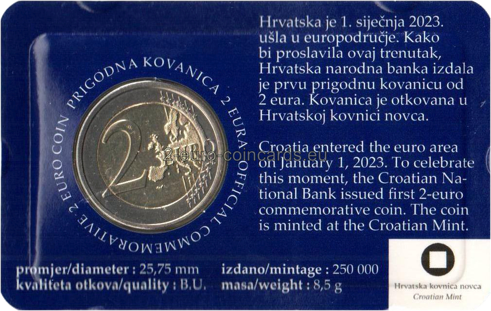 Chorvátsko vstúpilo do eurozóny 1. januára 2023. Na oslavu tohto okamihu vydala Chorvátska národná banka prvú pamätnú mincu v hodnote 2 eurá. Mincu razila chorvátska mincovňa.