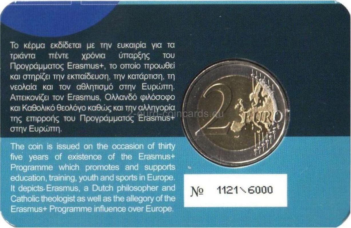 Minca sa vydáva pri príležitosti tridsiatich piatich rokov existencie programu Erasmus, ktorý podporuje vzdelávanie, odbornú prípravu, mládež a šport v Európe. Je na nej vyobrazený holandský filozof a katolícky teológ Erasmus, ako aj alegória vplyvu programu Erasmus+ na Európu.