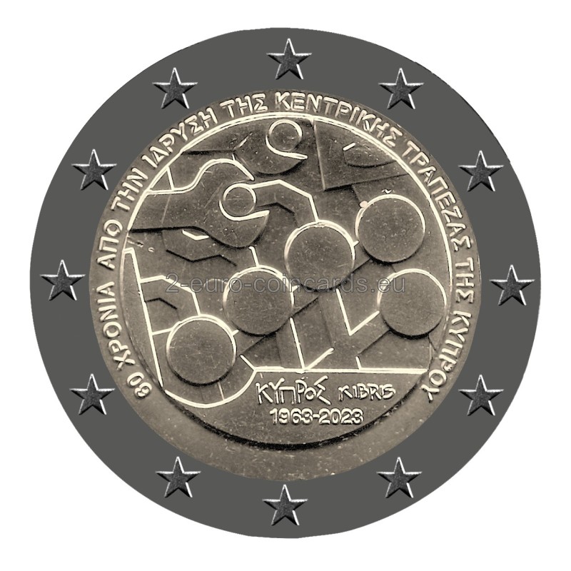 Na minci je vyobrazené náradie na mikročipe symbolizujúce stabilitu hospodárstva v modernej priemyselnej a digitálnej ére zabezpečenú Centrálnou bankou Cypru, V dolnej časti sa nachádza názov vydávajúcej krajiny „ΚYΠΡΟΣ KIBRIS“ a roky „1963 – 2023“. Vo vnútornej časti národnej strany mince je tiež uvedená veta „60 ΧΡOΝΙΑ ΑΠO ΤΗΝ IΔΡΥΣΗ ΤΗΣ ΚΕΝΤΡΙKHΣ ΤΡAΠΕΖΑΣ ΤΗΣ ΚYΠΡΟΥ“ (t. j. 60 rokov od založenia Centrálnej banky Cypru).