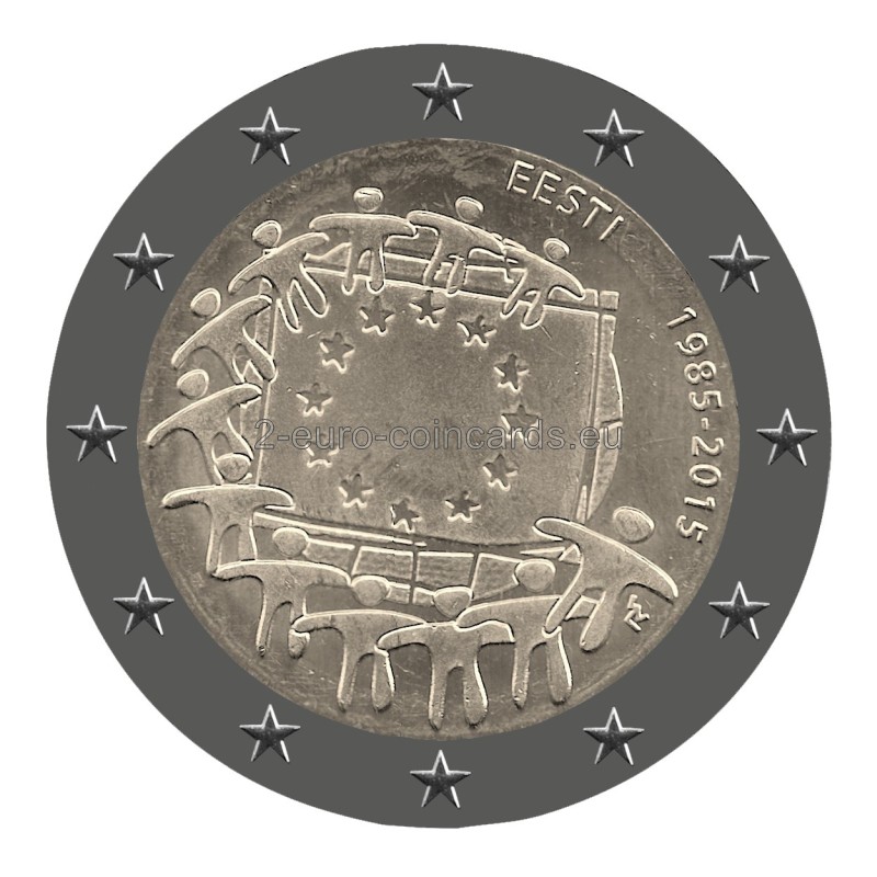 Vzor zobrazuje vlajku EÚ ako symbol, ktorý spája ľudí a kultúry s rovnakými víziami a ideálmi lepšej spoločnej budúcnosti. Dvanásť hviezd, ktoré sa menia na ľudské postavy, predstavuje zrodenie novej Európy. Vpravo hore je v polkruhu uvedený názov vydávajúcej krajiny „EESTI“ a roky „1985 – 2015“. Vpravo dolu sa nachádzajú iniciály umelca Georgiosa Stamatopoulosa „ΓΣ“.