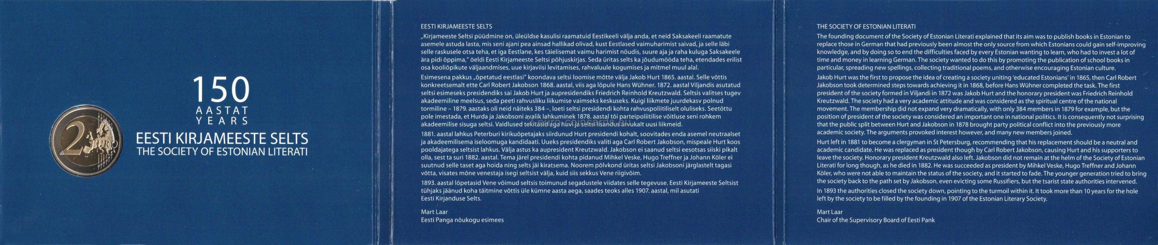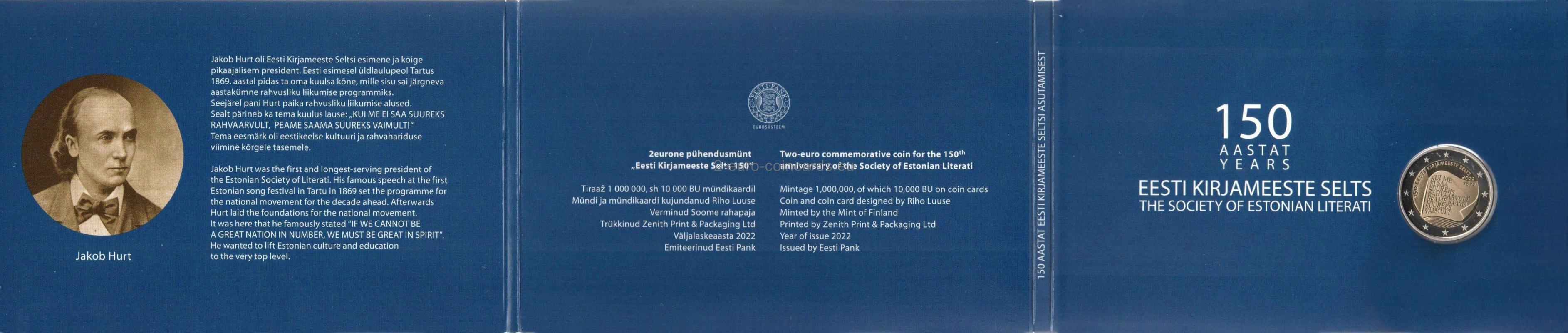 Vzor vyobrazuje strany knihy a špičku brka. V hornej časti je v polkruhu uvedený nápis „EESTI KIRJAMEESTE SELTS“ a rok vydania „2022“. Nápis na stranách knihy znie „KUI ME EI SAA SUUREKS RAHVAARVULT, PEAME SAAMA SUUREKS VAIMULT“, čo v preklade znamená, že „Ak nemôžeme byť veľkým národom v počte, musíme mať aspoň veľkého ducha“.