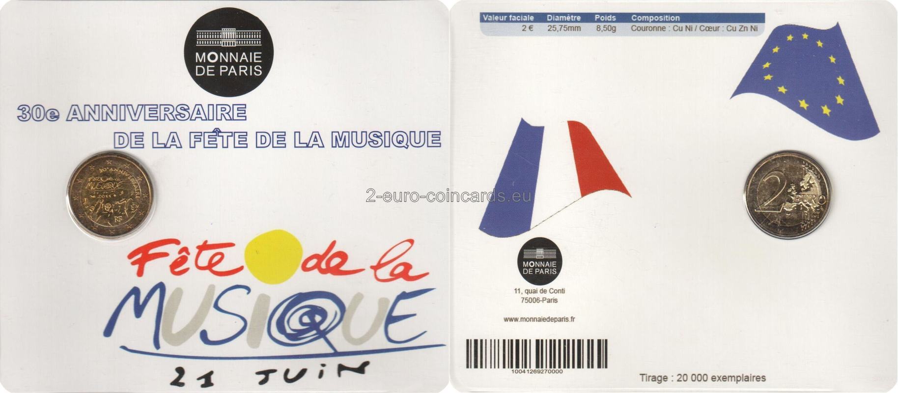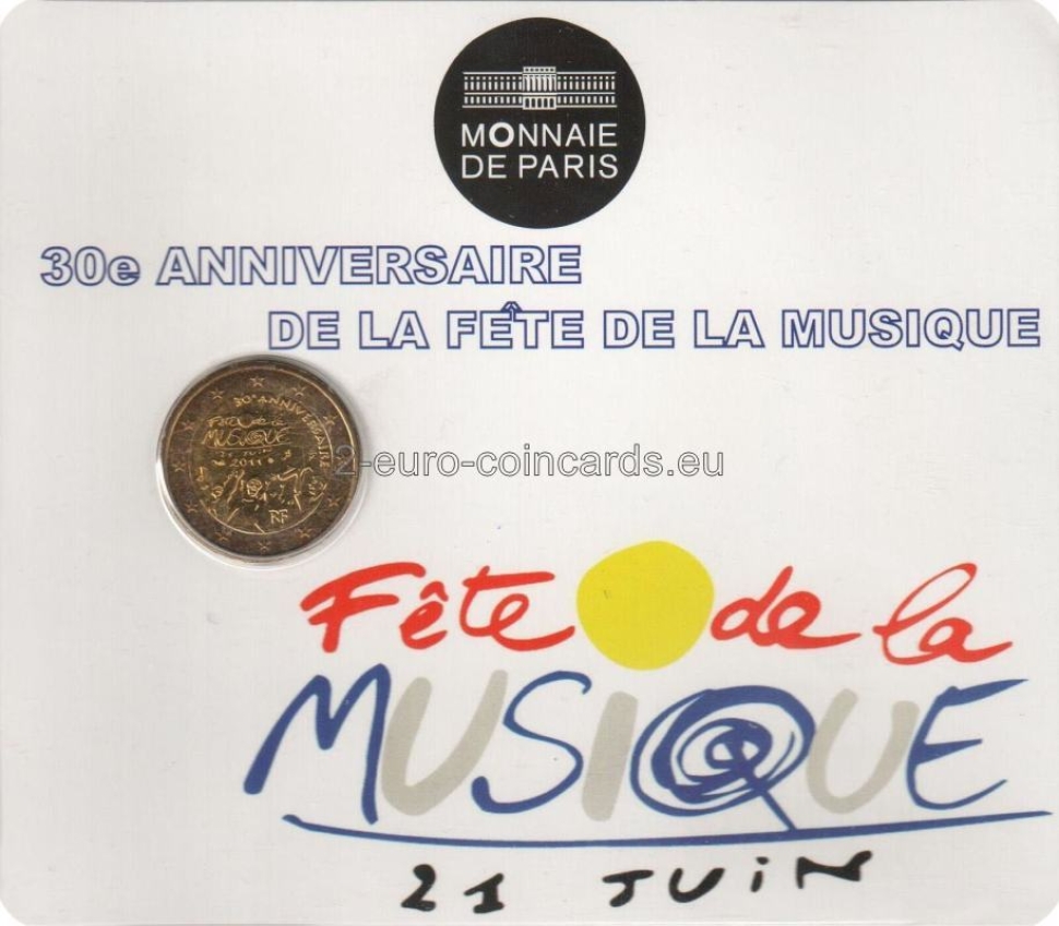 Na vnútornej strane mince sú zobrazené zástupy veselých ľudí so štylizovaným znázornením hudobného nástroja a notami poletujúcimi vo vzduchu na vyjadrenie slávnostnej atmosféry sviatku hudby. V strede obrázka je text „Fête de la MUSIQUE“ (Sviatok hudby) a dátum „21 JUIN 2011“ (21. jún 2011). V hornej časti sa smerom doprava nakláňa text „30 e ANNIVERSAIRE“ (30. výročie) a v spodnej časti je označenie krajiny „RF“. Okolo letopočtu 2011 sa nachádzajú značky parížskej mincovne (roh hojnosti), vedúceho rytca Yvesa Sampa (päťuholník).