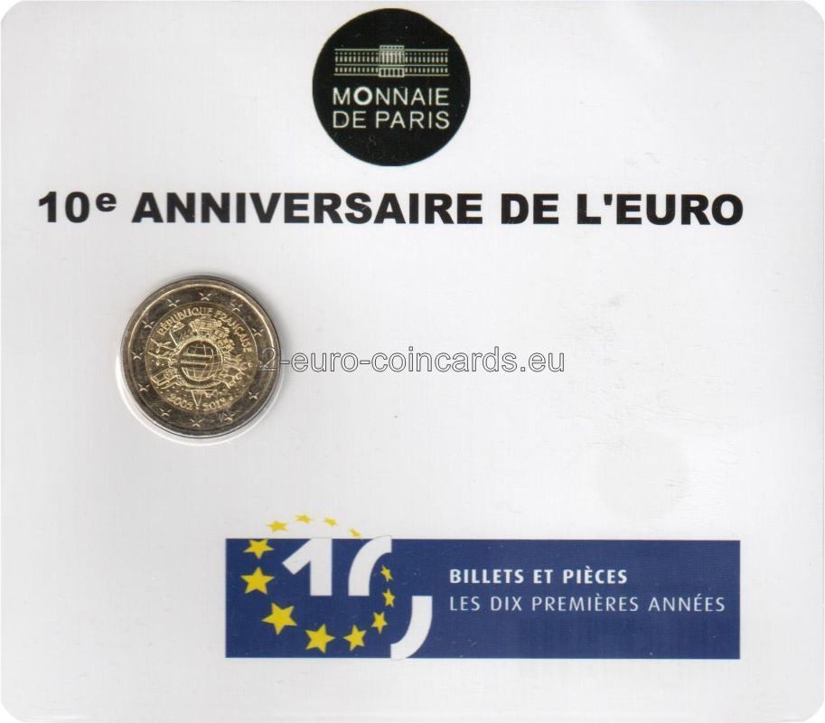 Znak eura v strede mince znamená, že euro sa stalo mimoriadne dôležitou súčasťou Európy, ale aj sveta, pretože sa v priebehu posledných 10 rokov stalo globálnym hráčom v rámci medzinárodného menového systému. Jednotlivé prvky motívu okolo symbolu eura na minci vyjadrujú význam eura pre ľudí, pre finančný svet (veža ECB), pre obchod (lode), priemysel (továrne), pre odvetvie energetiky, výskumu a vývoja (veterné elektrárne). Iniciály autora návrhu „A.H.“ sa dajú objaviť (ak sa pozriete veľmi pozorne) medzi loďou a budovou Eurotower. Pozdĺž horného okraja vnútornej časti mince je uvedená krajina vydania (RÉPUBLIQUE FRANÇAISE), zatiaľ čo označenie 2002 – 2012 je umiestnené v dolnej časti. V pravej časti sa nachádzajú značky parížskej mincovne (roh hojnosti) a vedúceho rytca Yvesa Sampa (päťuholník).