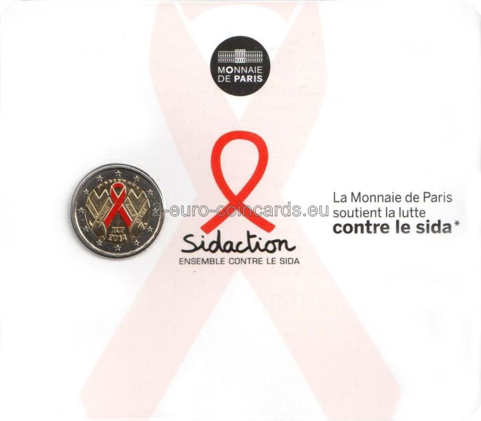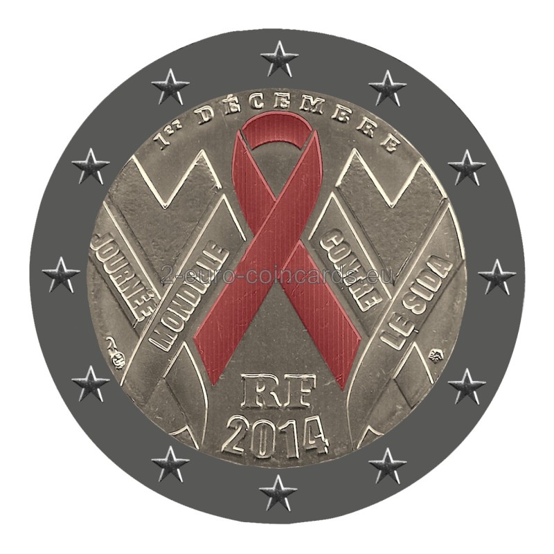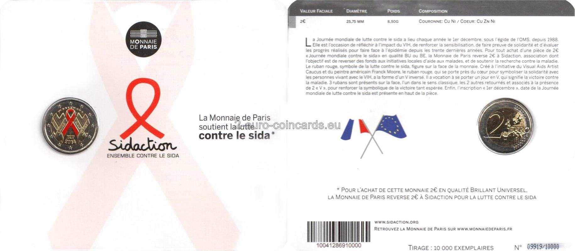 Svetový deň AIDS sa pod záštitou WHO koná každoročne 1. decembra od roku 1988. Je to príležitosť zamyslieť sa nad vplyvom HIV, zvýšiť informovanosť, prejaviť solidaritu a zhodnotiť pokrok, ktorý sa dosiahol v boji proti epidémii za posledných tridsať rokov. Za každý nákup mince "Svetový deň boja proti AIDS" v hodnote 2 € v kvalite BU alebo BE venuje Monnaie de Paris 2 € združeniu Sidaction, ktorého cieľom je venovať finančné prostriedky miestnym iniciatívam na podporu pacientov a na podporu výskumu tejto choroby. Na líci mince sa nachádza červená stužka, symbol boja proti AIDS. Červená stužka, ktorá sa nosí blízko srdca ako symbol solidarity s ľuďmi žijúcimi s HIV, vznikla z iniciatívy Visual Aids Artist Caucus a amerického maliara Francka Moora a má tvar obráteného písmena V. Má sa nosiť jeden deň ako V znamenajúce víťazstvo nad chorobou. Na prednej strane sú 3 stužky. Jedna je v tradičnom smere, ďalšie 2 sú obrátené a spojené s dvomi "V" na posilnenie symboliky dlho očakávaného víťazstva. Nakoniec sa v hornej časti mince nachádza nápis "1. december", dátum Svetového dňa boja proti AIDS.