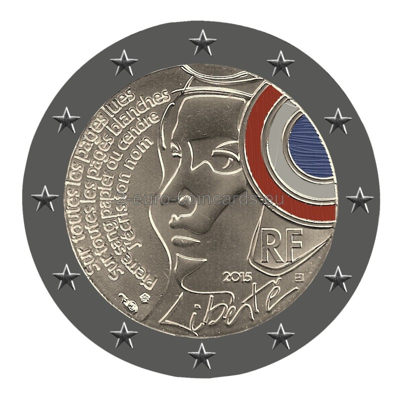 Francúzsky štátny sviatok „Fête de la Fédération“ združuje všetkých Francúzov pri príležitosti osláv republiky. Motívom mince je grafickým, moderným spôsobom zobrazený profil Marianne, symbolu republiky. Marianne má na hlave frýgickú čiapku. Na pravej strane je načrtnutá kokarda a pod ňou sú písmená „RF“. Uprostred mince je uvedený rok „2015“. Na ľavej strane sa nachádza strofa "Sur toutes les pages lues Sur toutes les pages blanches Pierre sang papier ou cendre J’ecris ton nom" (Na všetky stránky, ktoré som čítal Na všetky prázdne listy Ku kameňu krvi, papiera a popola píšem tvoje meno) básne „Sloboda“ francúzskeho básnika Paula Éluarda, ktorá je odkazom na heslo republiky. Vedľa tohto úryvku sú uvedené značky sú značky parížskej mincovne Monnaie de Paris (roh hojnosti) a hlavného rytca Yvesa Sampa (päťuholník). Obrázok blistra vychádza z pohľadnice z konca 19. storočia.