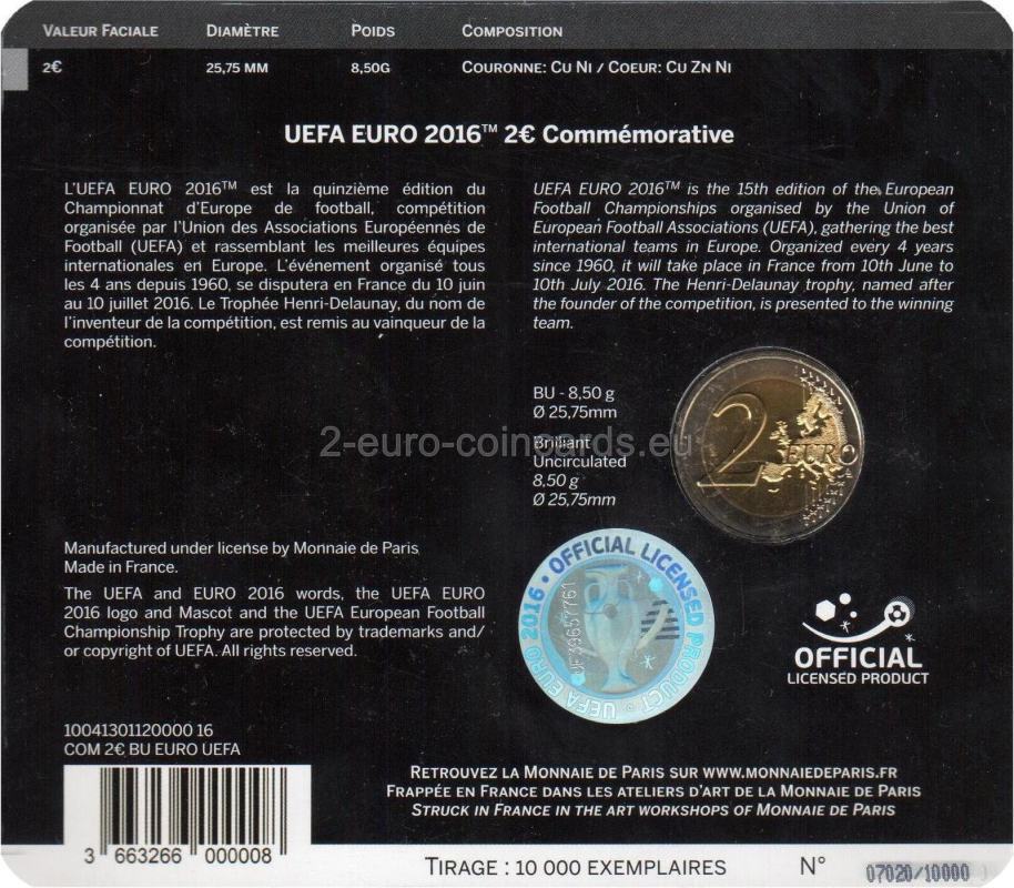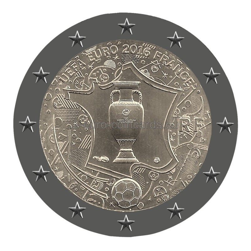Na minci je vyobrazený pohár Henriho Delaunaya uprostred obrysu mapy Francúzska spolu s značkami parížskej mincovne Monnaie de Paris (roh hojnosti) a hlavného rytca Yvesa Sampa (päťuholník). Napravo od mapy Francúzska sú uvedené iniciálky Francúzskej republiky „RF“. Nad mapou Francúzska vytvára pomyselnú korunu názov súťaže „UEFA EURO 2016 France“. V spodnej časti mince vystupuje do popredia lopta. Toto všetko je umiestnené na pozadí, ktoré tvoria grafické prvky reprezentujúce súťaž.