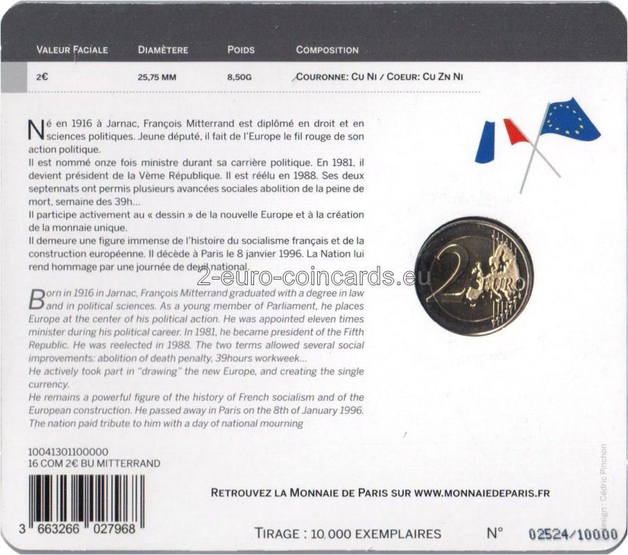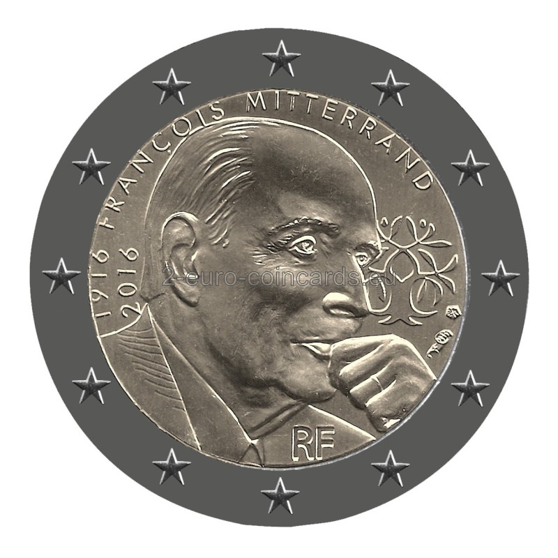 Na minci je načrtnutá tvár zamysleného Françoisa Mitterranda z profilu. Vedľa je zobrazený Mitterandov osobný emblém, prepletené vetvy duba a olivovníka. Nižšie sú značky parížskej mincovne Monnaie de Paris (roh hojnosti) a hlavného rytca Yvesa Sampa (päťuholník). V hornej časti je uvedený jeho dátum narodenia a stého výročia narodenia („1916“ a „2016“), ako aj jeho meno. Dole je uvedené označenie vydávajúcej krajiny „RF“.