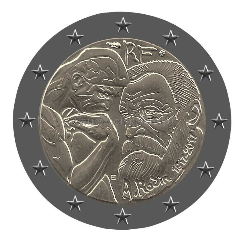 Parížska mincovňa Monnaie de Paris vzdáva hold významnému francúzskemu sochárovi Augustovi Rodinovi pri príležitosti 100. výročia jeho úmrtia. Motív mince zobrazuje naproti sebe Augusta Rodina a jeho najznámejšiu sochu Mysliteľ. Iniciály RF označujúce République française (Francúzska republika) sú znázornené v hornej časti mince v takej podobe, akoby ich vytesal sochár. Meno sochára „A. Rodin“ a roky „1917–2017“ zodpovedajúce výročiu sú zapísané na umelcovej brade. Po stranách sú značky parížskej mincovne Monnaie de Paris (roh hojnosti) a hlavného rytca Yvesa Sampa (päťuholník).