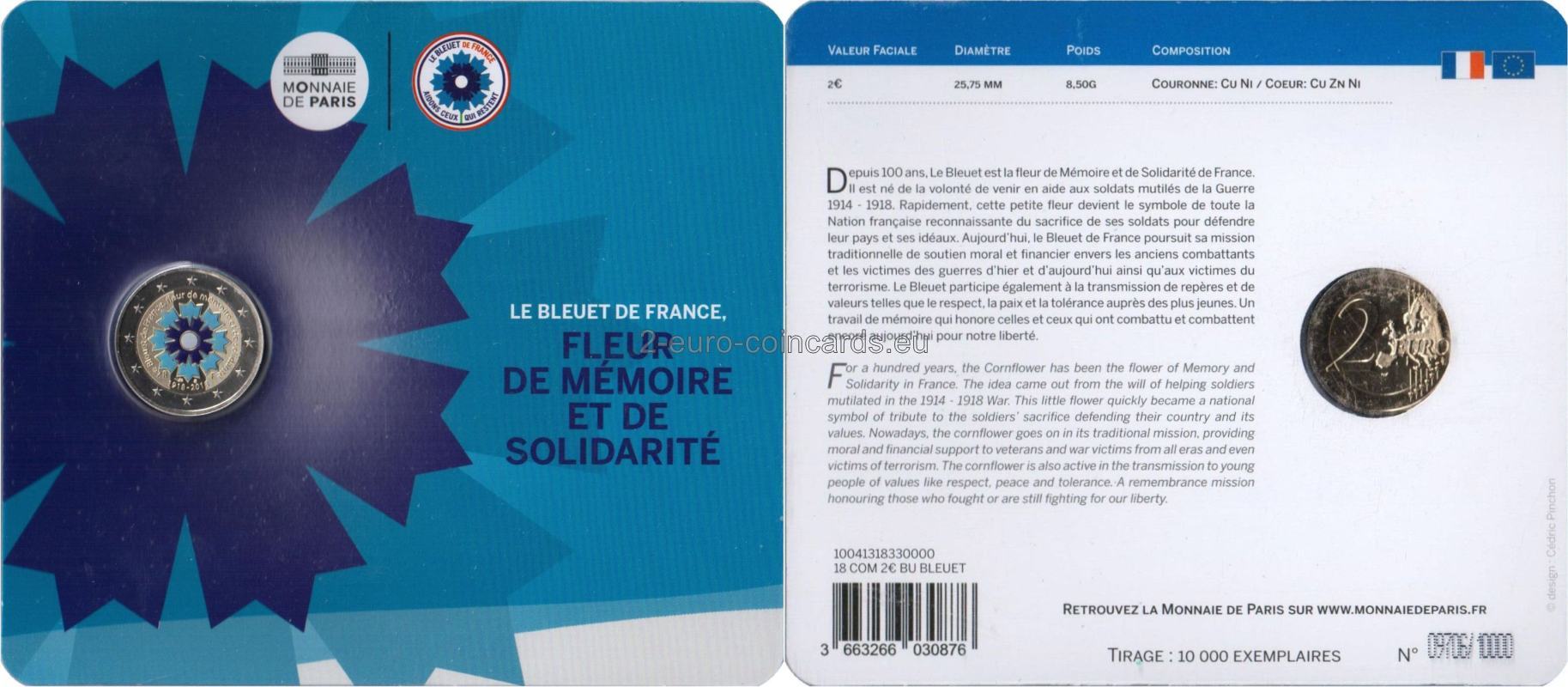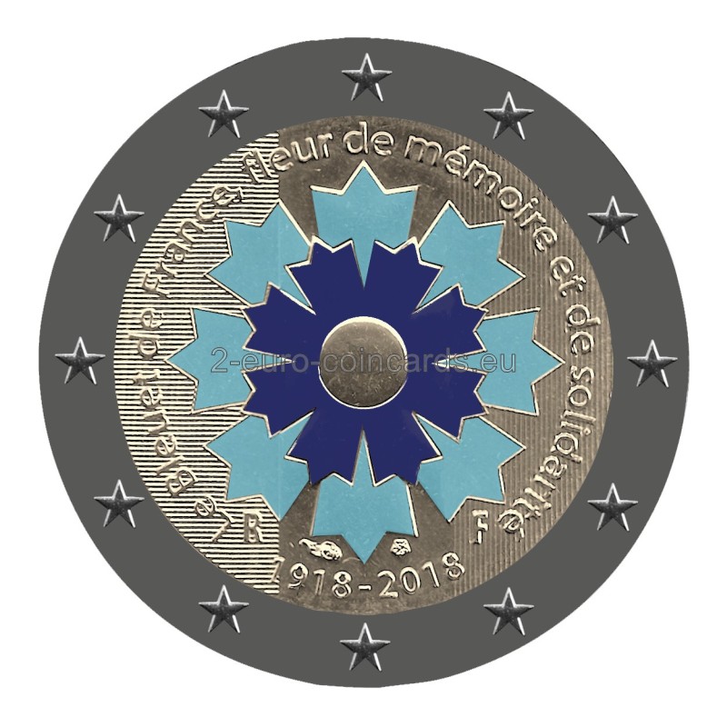 Ústredným motívom vzoru je kvet nevädze. Obkolesuje ho nápis: „Le Bleuet de France, fleur de mémoire et de solidarité“ (Francúzska nevädza, kvet pamiatky a solidarity). V spodnej časti vzoru sú uvedené dátumy „1918 – 2018“, iniciály „RF“ a značky parížskej mincovne Monnaie de Paris (roh hojnosti) a hlavného rytca Yvesa Sampa (päťuholník).