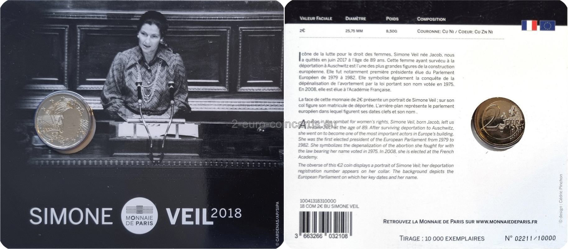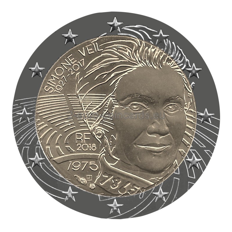 Ikona boja za práva žien. Simone Veilová, rodená Jacobová, zomrela v júni 2017 vo veku 89 rokov. Táto žena, ktorá prežila deportáciu do Osvienčimu, bola jednou z najväčších osobností budovania Európy. V rokoch 1979 až 1982 bola prvou zvolenou predsedníčkou Európskeho parlamentu. Symbolizuje aj vybojovanie dekriminalizácie potratov prostredníctvom zákona nesúceho jej meno, ktorý bol prijatý v roku 1975. V roku 2008 bola zvolená za členku Francúzskej akadémie. Na prednej strane tejto mince v hodnote 2 € je portrét Simone Veilovej s číslom jej deportácie na hlave. Na pozadí je zobrazený Európsky parlament s kľúčovými dátumami a jej meno.