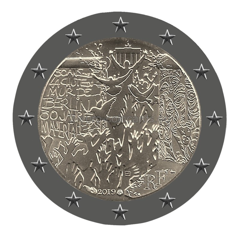 Na minci je vyobrazený Berlínsky múr s otvorom uprostred, ktorým prelietajú holubice (alegória medzinárodného uzmierenia) a prechádza oslavujúci dav. V pozadí sa nachádza Brandenburská brána, ktorá je typickým symbolom Berlína. Na jednej strane múru je nápis „30. výročie pádu Berlínskeho múru/30 Jahre Mauerfall“. V spodnej časti návrhu je uvedený rok vydania „2019“ a napravo označenie vydávajúcej krajiny „RF“ (République Française). V spodnej časti sú značky parížskej mincovne Monnaie de Paris (roh hojnosti) a hlavného rytca Yvesa Sampa (päťuholník).