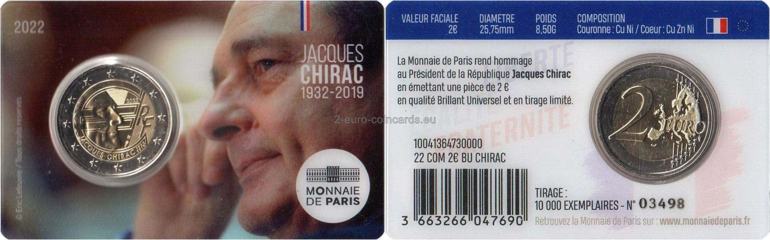 Monnaie de Paris vzdáva hold francúzskemu prezidentovi Jacquesovi Chiracovi vydaním mince v hodnote 2 € v kvalite BU v limitovanej edícii.