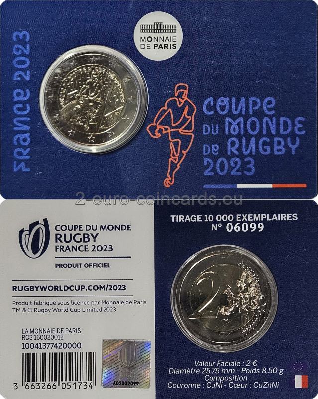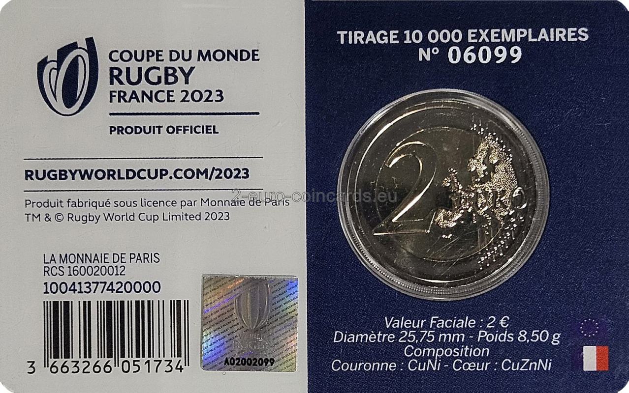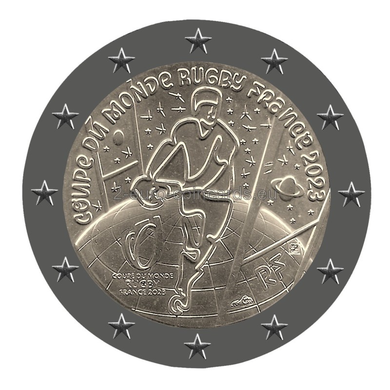 Na minci je vyobrazený štylizovaný ragbista, ktorý prihráva spoluhráčovi. V pozadí sa nachádza ihrisko v podobe zemegule, na ktorom sú umiestnené ragbyové bránky. Vyobrazenie je súčasťou imaginárnej ragbyovej galaxie a planét oválneho tvaru. Vedľa hráča sa nachádza logo súťaže, zatiaľ čo jej názov je uvedený okolo vyobrazenia. Pod ním je vpravo uvedené označenie vydávajúcej krajiny „RF“, značka mincovne a značka rytca. Vľavo sa nachádza názov súťaže, vydávajúca krajina „FRANCÚZSKO“ a rok „2023“. Názov súťaže a označenie „RF“ sú napísané v oficiálnom písme podujatia, ktoré sa nazýva Mobius.