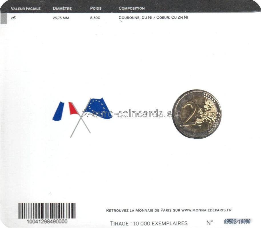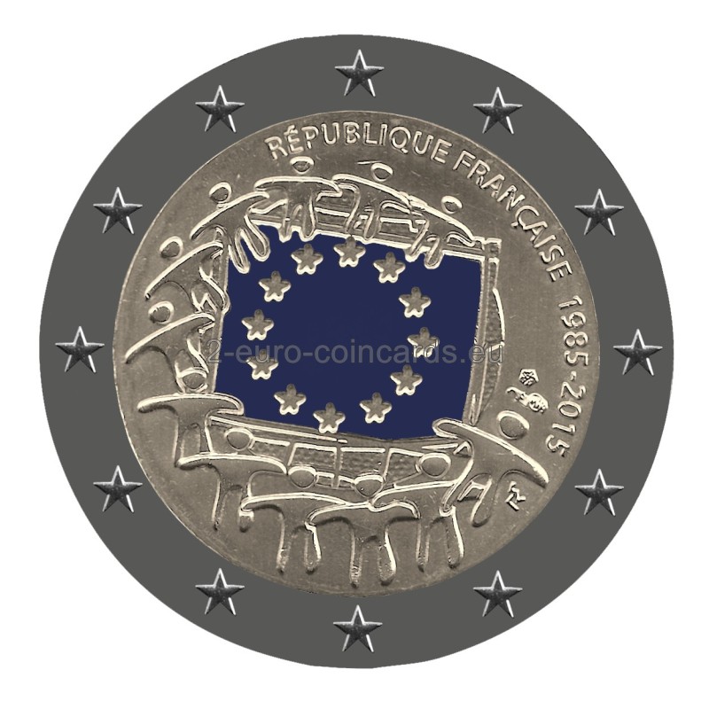 Vzor zobrazuje vlajku EÚ ako symbol, ktorý spája ľudí a kultúry s rovnakými víziami a ideálmi lepšej spoločnej budúcnosti. Dvanásť hviezd, ktoré sa menia na ľudské postavy, predstavuje zrodenie novej Európy. Vpravo hore je v polkruhu uvedený názov vydávajúcej krajiny „RÉPUBLIQUE FRANÇAISE“ a roky „1985 – 2015“. Vpravo dolu sa nachádzajú iniciály umelca Georgiosa Stamatopoulosa.