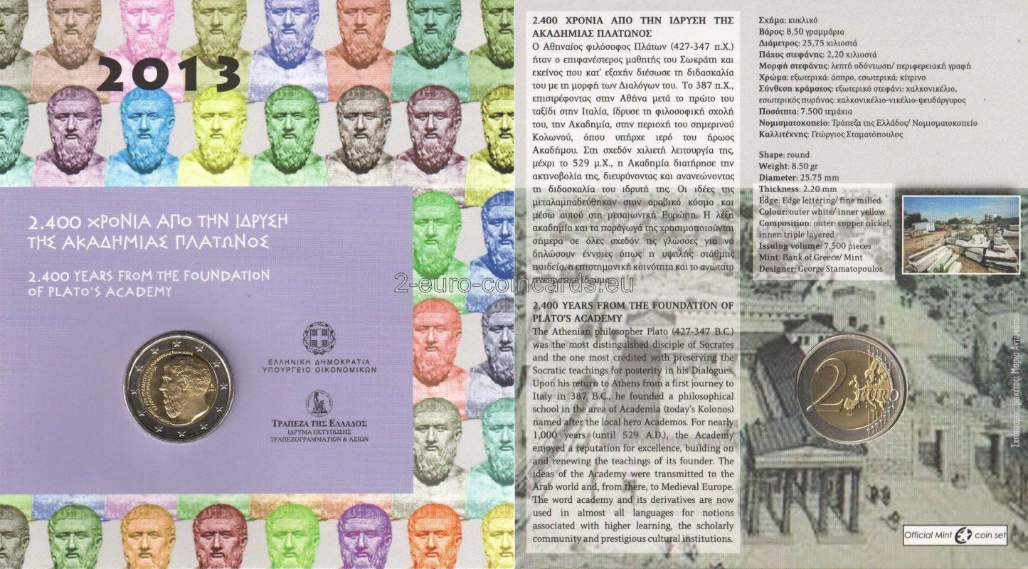 Motív znázorňuje Platónov portrét z profilu. Vľavo sa nachádzajú nápisy v starej gréčtine: „2400 ΧΡΟΝΙΑ ΑΠΟ ΤΗΝ ΙΔΡΥΣΗ ΤΗΣ ΑΚΑΔΗΜΙΑΣ ΠΛΑΤΩΝΟΣ“ (2400 rokov od založenia Platónovej akadémie) a „ΕΛΛΗΝΙΚΗ ΔΗΜΟΚΡΑΤΙΑ“ (HELÉNSKA REPUBLIKA). Vpravo sa nachádza letopočet „2013“ a značka Gréckej štátnej mincovne (palmeta-ornament z listov akanty). Monogram autora George Stamatopoulosa, „ΣΤΑΜ“, sa nachádza na druhej strane.