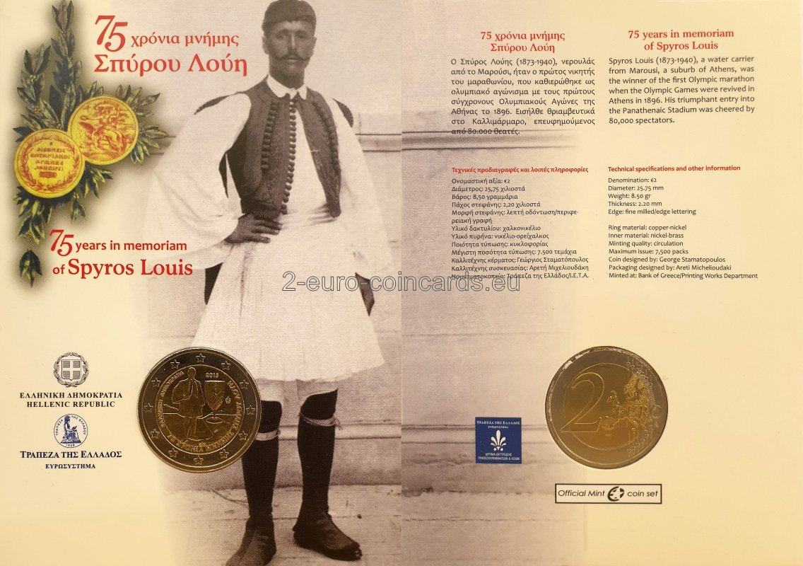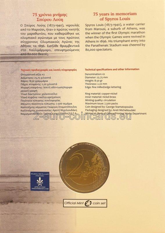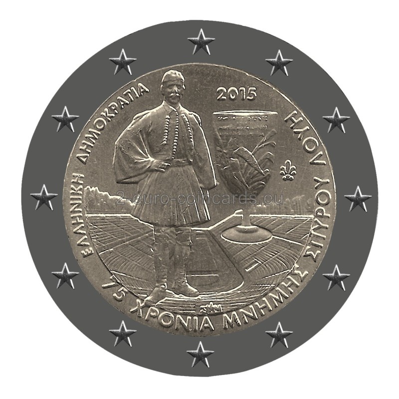 Vzor znázorňuje Spyrosa Louisa,víťaza OH 1896 a pohár, ktorý získal. V pozadí je vyobrazený Panaténsky štadión. Pozdĺž okraja vnútornej časti mince je vypísaný v gréčtine názov vydávajúcej krajiny „ΕΛΛΗΝΙΚΗ ΔΗΜΟΚΡΑΤΙΑ“ (HELÉNSKA REPUBLIKA a nápis „75 ΧΡΟΝΙΑ ΜΝΗΜΗΣ ΣΠΥΡΟΥ ΛΟΥΗ“ (75 ROKOV OD ÚMRTIA SPYROSA LOUISA). Nad pohárom je uvedený rok vydania „2015“ a napravo od pohára sa nachádza značka Gréckej štátnej mincovne (palmeta-ornament z listov akanty). V spodnej časti vzoru sa nachádza „ΣΤΑΜ“, značka autora George Stamatopoulosa.
