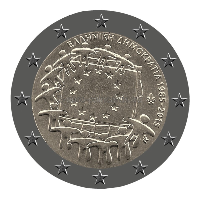 Vzor zobrazuje vlajku EÚ ako symbol, ktorý spája ľudí a kultúry s rovnakými víziami a ideálmi lepšej spoločnej budúcnosti. Dvanásť hviezd, ktoré sa menia na ľudské postavy, predstavuje zrodenie novej Európy. Vpravo hore je v polkruhu uvedený názov vydávajúcej krajiny v gréčtine „ΕΛΛΗΝΙΚΗ ΔΗΜΟΚΡΑΤΙΑ“ (HELÉNSKA REPUBLIKA) a roky „1985 – 2015“. Vpravo dolu sa nachádza „ΣΤΑΜ“, značka autora George Stamatopoulosa.