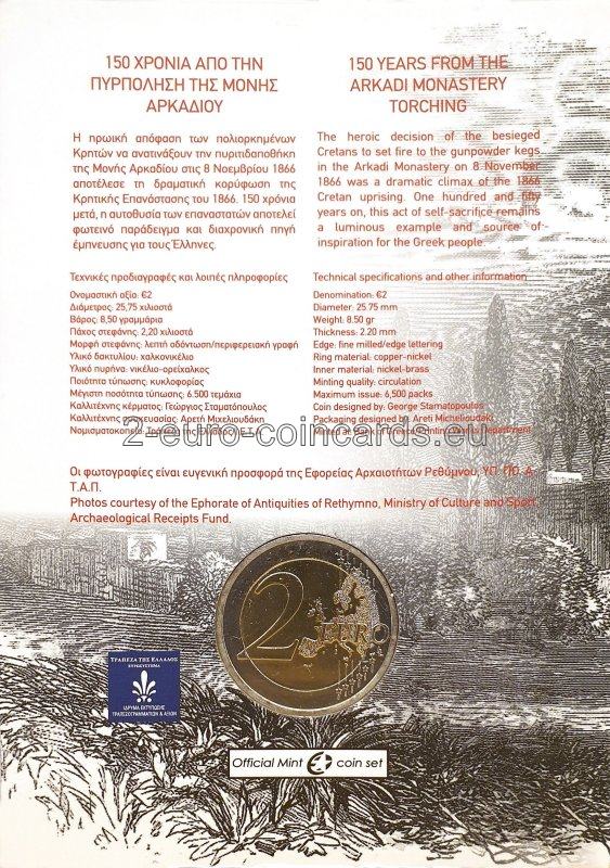 Motív zobrazuje kláštor Arkadi. V strede je nápis v gréčtine „ΜΟΝΗ ΑΡΚΑΔΙΟΥ“ (KLÁŠTOR ARKADI) a pozdĺž okraja vnútornej časti mince vľavo nápis v gréčtine „ΕΛΛΗΝΙΚΗ ΔΗΜΟΚΡΑΤΙΑ“ (HELÉNSKA REPUBLIKA). Vpravo hore je uvedený rok vydania „2016“ a pod nápisom v strede sa nachádza značka gréckej štátnej mincovne (palmeta-ornament z listov akanty). V dolnej časti vpravo sa nachádza „ΣΤΑΜ“, značka autora George Stamatopoulosa.