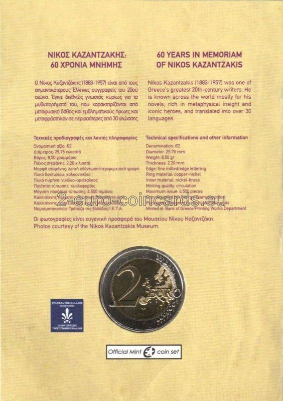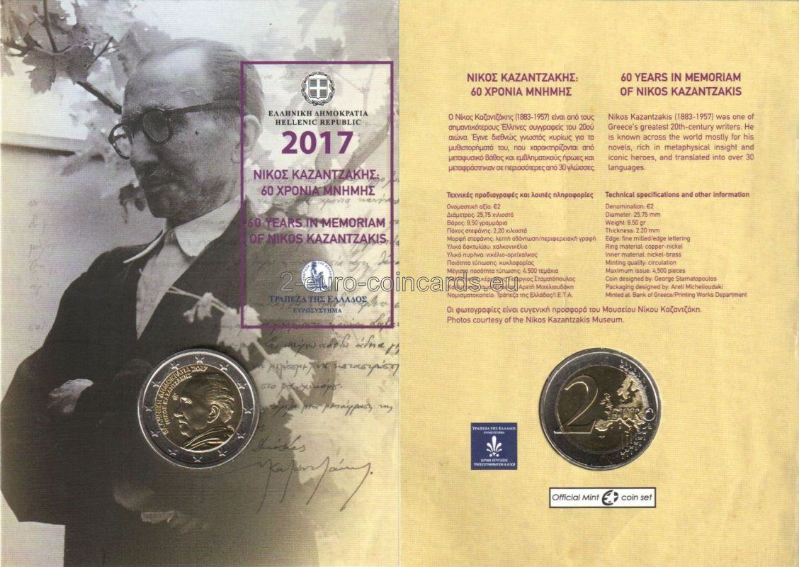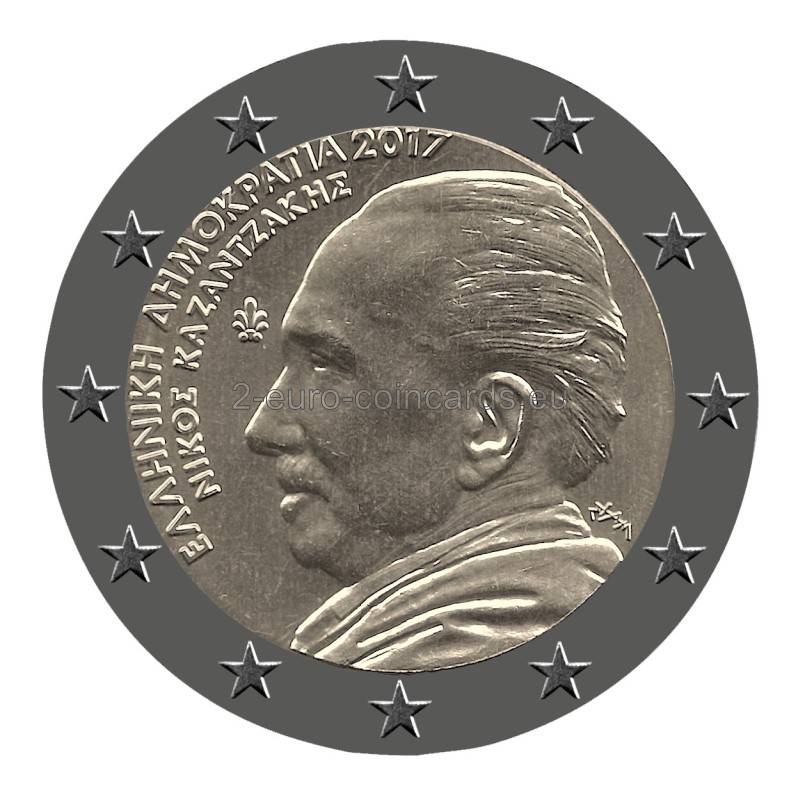 Vzor znázorňuje portrét Nikosa Kazantzakisa z profilu. Pozdĺž vnútorného kruhu mince vľavo je vyrytý nápis v gréčtine „ΕΛΛΗΝΙΚΗ ΔΗΜΟΚΡΑΤΙΑ“ (HELÉNSKA REPUBLIKA) a meno umelca „ΝΙΚΟΣ ΚΑΖΑΝΤΖΑΚΗΣ“ (NIKOS KAZANTZAKIS). V hornej časti sa nachádza rok vydania mince „2017“ a v strede mince vľavo značka gréckej štátnej mincovne (palmeta-ornament z listov akanty). Vpravo dole sa nachádza „ΣΤΑΜ“, značka autora George Stamatopoulosa.