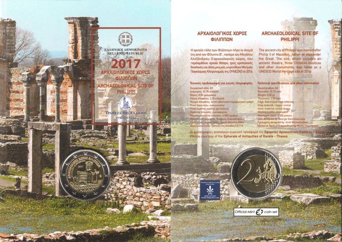 Vzor zobrazuje časť Baziliky B a lineárne motívy inšpirované pohraničným vzorom z antickej gréckej mozaiky, ktorá bola objavená na nálezisku. Pozdĺž vnútorného kruhu mince sú vyryté nápisy v gréčtine „ΑΡΧΑΙΟΛΟΓΙΚΟΣ ΧΩΡΟΣ ΦΙΛΙΠΠΩΝ“ (ARCHEOLOGICKÉ NÁLEZISKO PHILIPPI) a „ΕΛΛΗΝΙΚΗ ΔΗΜΟΚΡΑΤΙΑ“ (HELÉNSKA REPUBLIKA). V pozadí je takisto vyrytý rok vydania mince „2017“ a napravo sa nachádza značka gréckej štátnej mincovne (palmeta-ornament z listov akanty). Vľavo dole sa nachádza „ΣΤΑΜ“, značka autora George Stamatopoulosa.