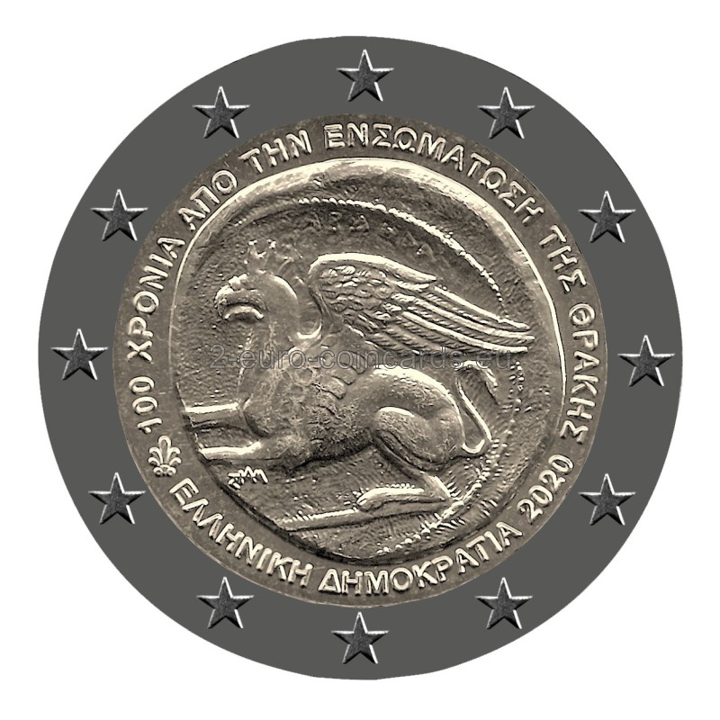 Vzor kopíruje starodávnu mincu tráckeho mesta Abdéra s gryfom (mýtické zviera s časťami tiel rôznych živočíchov). Na vnútornom okraji sú vpísané slová v gréčtine „100 ΧΡΟΝΙΑ ΑΠΟ ΤΗΝ ΕΝΣΩΜΑΤΩΣΗ ΤΗΣ ΘΡΑΚΗΣ“ (100. VÝROČIE ZJEDNOTENIA TRÁCIE S GRÉCKOM) a „ΕΛΛΗΝΙΚΗ ΔΗΜΟΚΡΑΤΙΑ“ (HELÉNSKA REPUBLIKA), ako aj rok vydania „2020“ a značka gréckej štátnej mincovne (palmeta-ornament z listov akanty). Vľavo sa nachádza značka autora George Stamatopoulosa (ΣΤΑΜ).