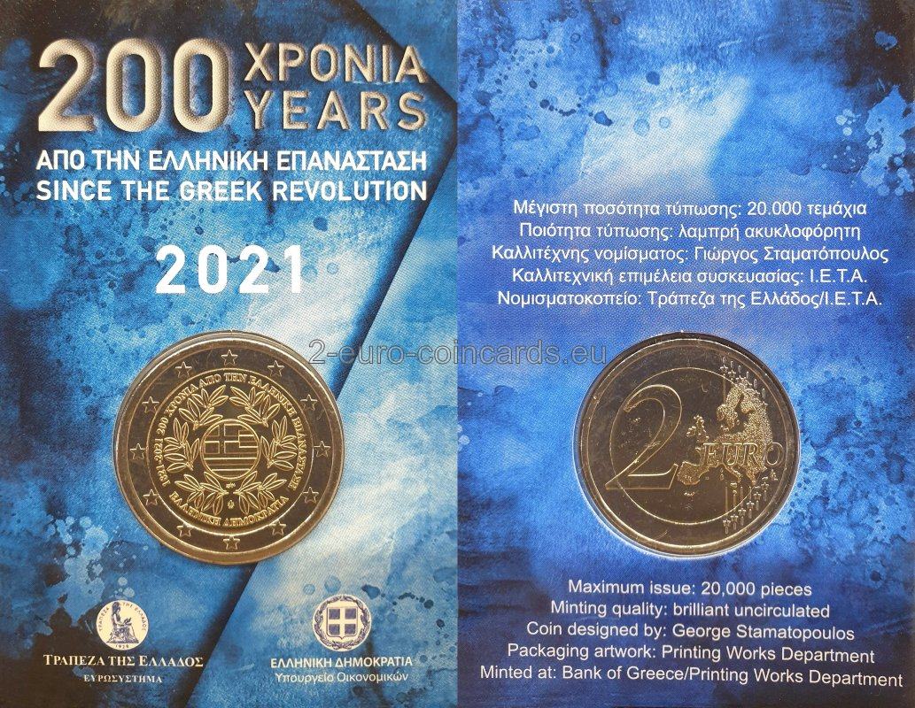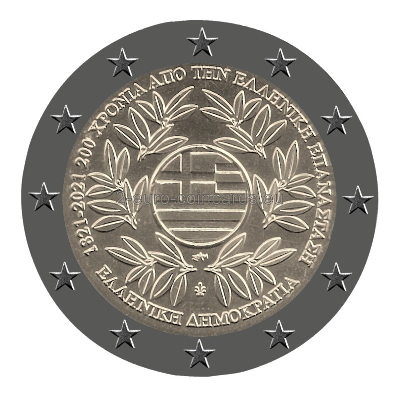 V strednej časti vzoru je vyobrazená grécka vlajka, ktorú obklopujú vavrínové vetvičky. Na vnútornom okraji sú vpísané slová v gréčtine „1821—2021 200 ΧΡΟΝΙΑ ΑΠΟ ΤΗΝ ΕΛΛΗΝΙΚΗ ΕΠΑΝΑΣΤΑΣΗ“ (1821 – 2021 200. VÝROČIE GRÉCKEHO POVSTANIA) a „ΕΛΛΗΝΙΚΗ ΔΗΜΟΚΡΑΤΙΑ“ (HELÉNSKA REPUBLIKA). V dolnej časti mince je medzi dvoma vavrínovými vetvičkami vyobrazená značka Gréckej štátnej mincovne (palmeta-ornament z listov akanty) a „ΣΤΑΜ“, značka autora George Stamatopoulosa.