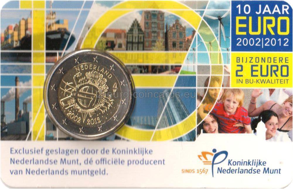Znak eura v strede mince znamená, že euro sa stalo mimoriadne dôležitou súčasťou Európy, ale aj sveta, pretože sa v priebehu posledných 10 rokov stalo globálnym hráčom v rámci medzinárodného menového systému. Jednotlivé prvky motívu okolo symbolu eura na minci vyjadrujú význam eura pre ľudí, pre finančný svet (veža ECB), pre obchod (lode), priemysel (továrne), pre odvetvie energetiky, výskumu a vývoja (veterné elektrárne). Iniciály autora návrhu „A.H.“ sa dajú objaviť (ak sa pozriete veľmi pozorne) medzi loďou a budovou Eurotower. Pozdĺž horného okraja vnútornej časti mince je uvedená krajina vydania (NEDERLAND), zatiaľ čo označenie 2002 – 2012 je umiestnené v dolnej časti. V pravej časti sa nachádza značka rytca Maartena Brouwera (plachetnica) a značka mincovne v Utrechte (Merkúrová palica).