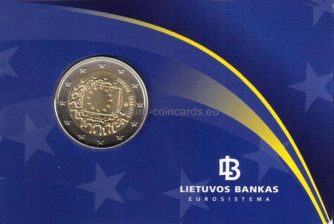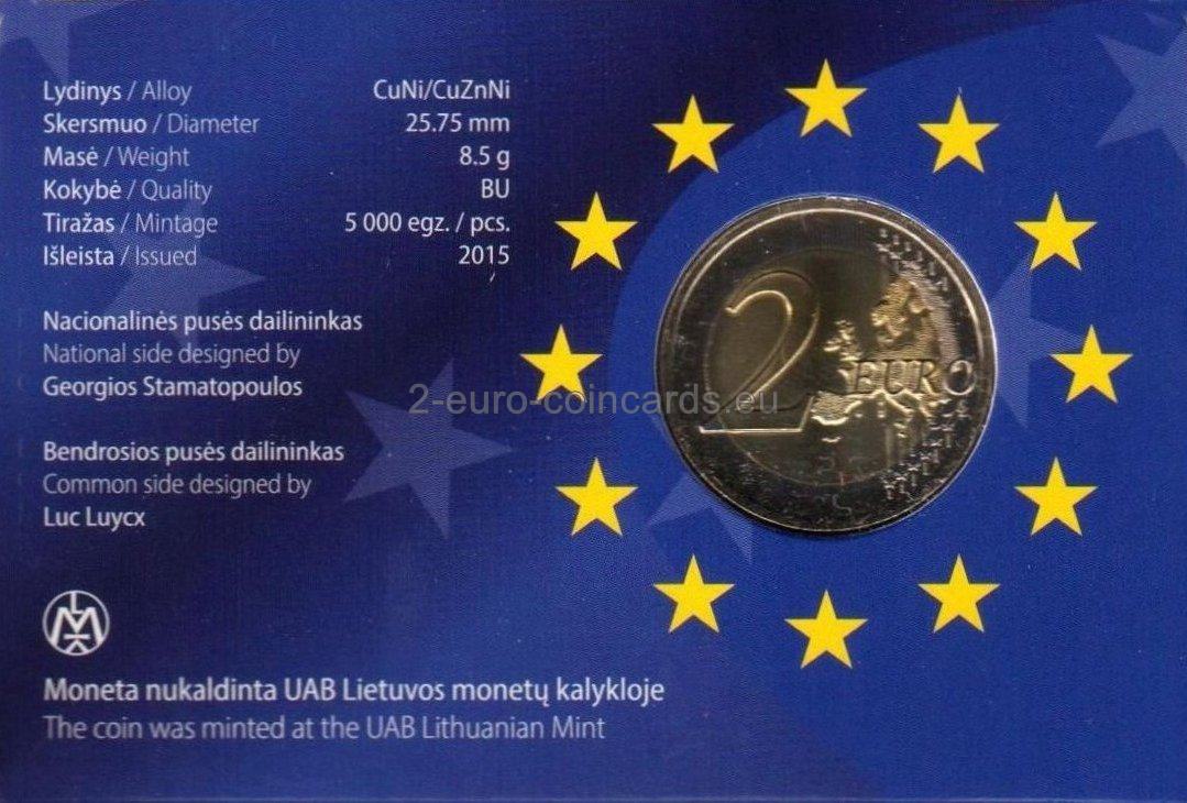 Vzor zobrazuje vlajku EÚ ako symbol, ktorý spája ľudí a kultúry s rovnakými víziami a ideálmi lepšej spoločnej budúcnosti. Dvanásť hviezd, ktoré sa menia na ľudské postavy, predstavuje zrodenie novej Európy. Vpravo hore je v polkruhu uvedený názov vydávajúcej krajiny „LIETUVA“ a roky „1985 – 2015“. Vpravo dolu sa nachádzajú iniciály umelca Georgiosa Stamatopoulosa