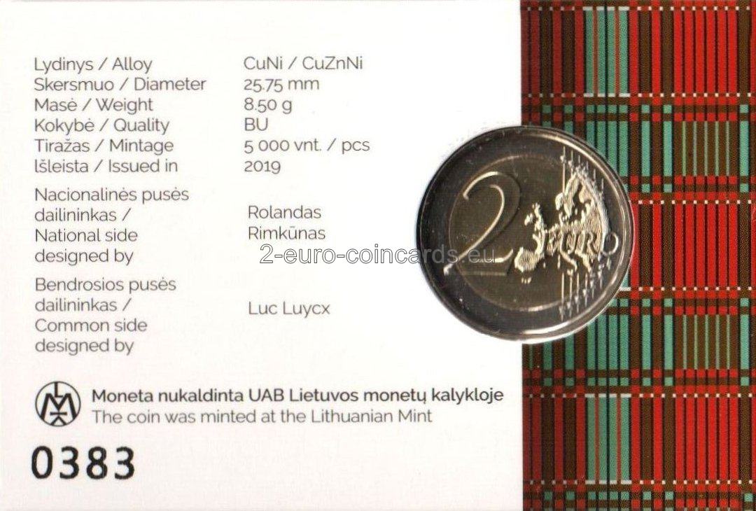 Ústredným motívom je medveď stojaci na zadných nohách, ktorý má na krku kovový obojok. Jeho podobizeň zdobí erb Žemajtska už od 16. storočia. Medveď je umiestnený na štíte, na ktorom leží koruna. Štít podopierajú vojak v brnení (symbol odvahy, obetovania sa a vlastenectva) a bohyňa držiaca kotvu (symbol nádeje). V dolnej časti sa nachádza latinský nápis „PATRIA UNA“ (jedna vlasť). Motív obklopujú nápisy „LIETUVA“ (Litva) a „ŽEMAITIJA“ (Žemajtsko), rok vydania „2019“ a značka litovskej mincovne.