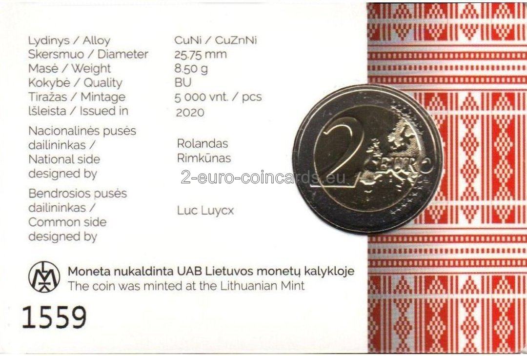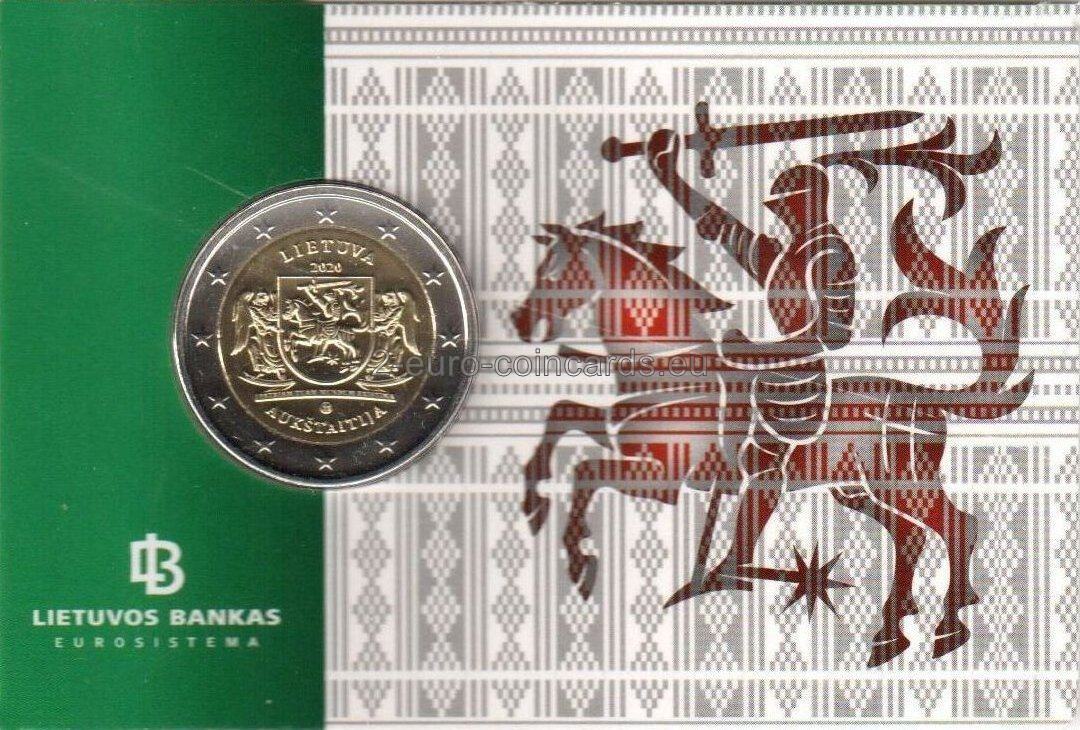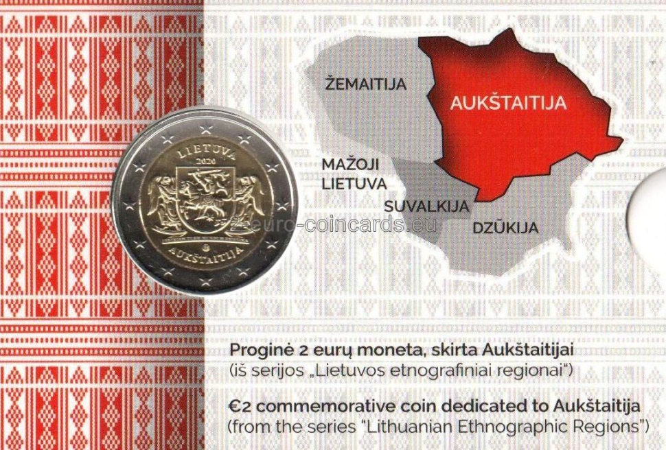 Na vzore je zobrazený štátny znak a rytier v brnení, ktorý v pravej ruke drží meč. Štátny znak držia dvaja anjeli, ktorí symbolicky vyzdvihujú a ochraňujú región Aukštaitija – jeden z najvýznamnejších regiónov Litvy a kolískou jej štátnosti. Pod obrázkom je latinský nápis „PATRIAM TUAM MUNDUM EXISTIMA“ (POVAŽUJ SVOJU VLASŤ ZA CELÝ SVET). Okolo vzoru sú tieto nápisy: „LIETUVA“ (názov vydávajúcej krajiny), „AUKŠTAITIJA“, rok vydania „2020“ a značka litovskej mincovne.