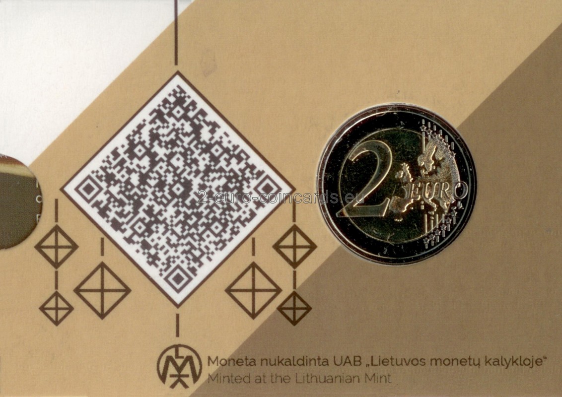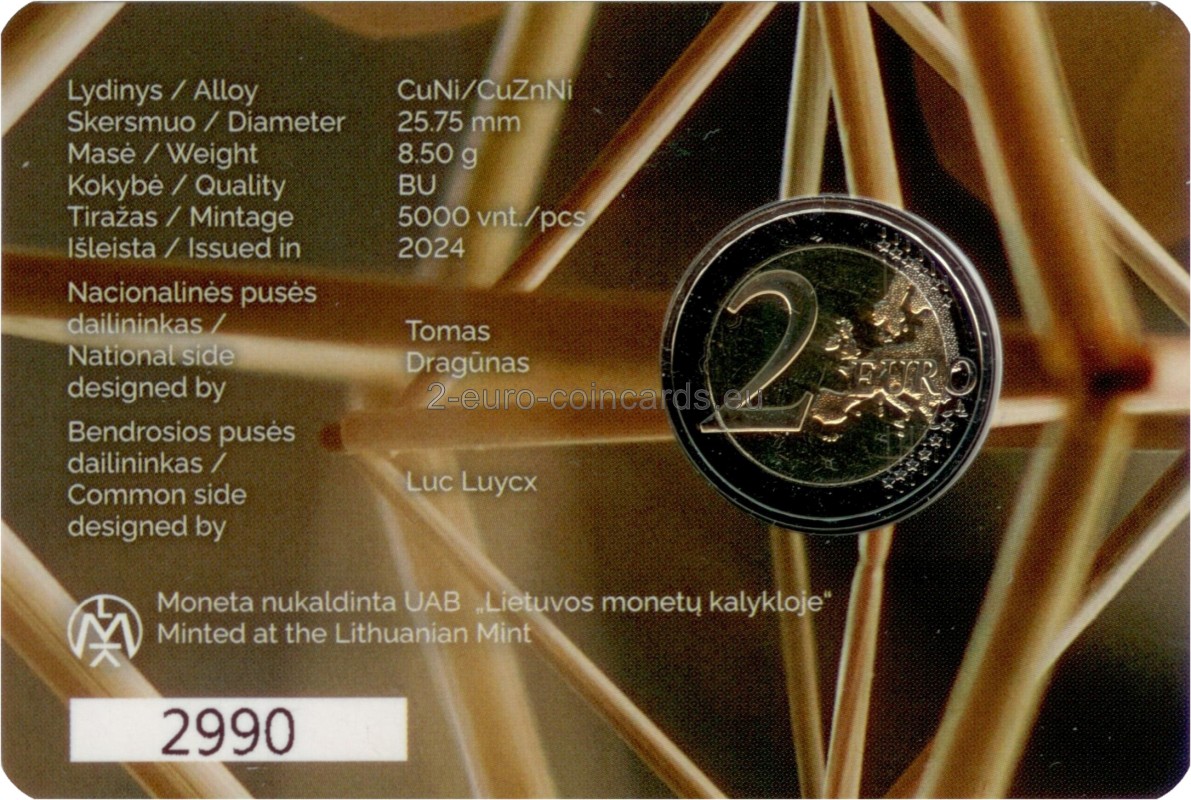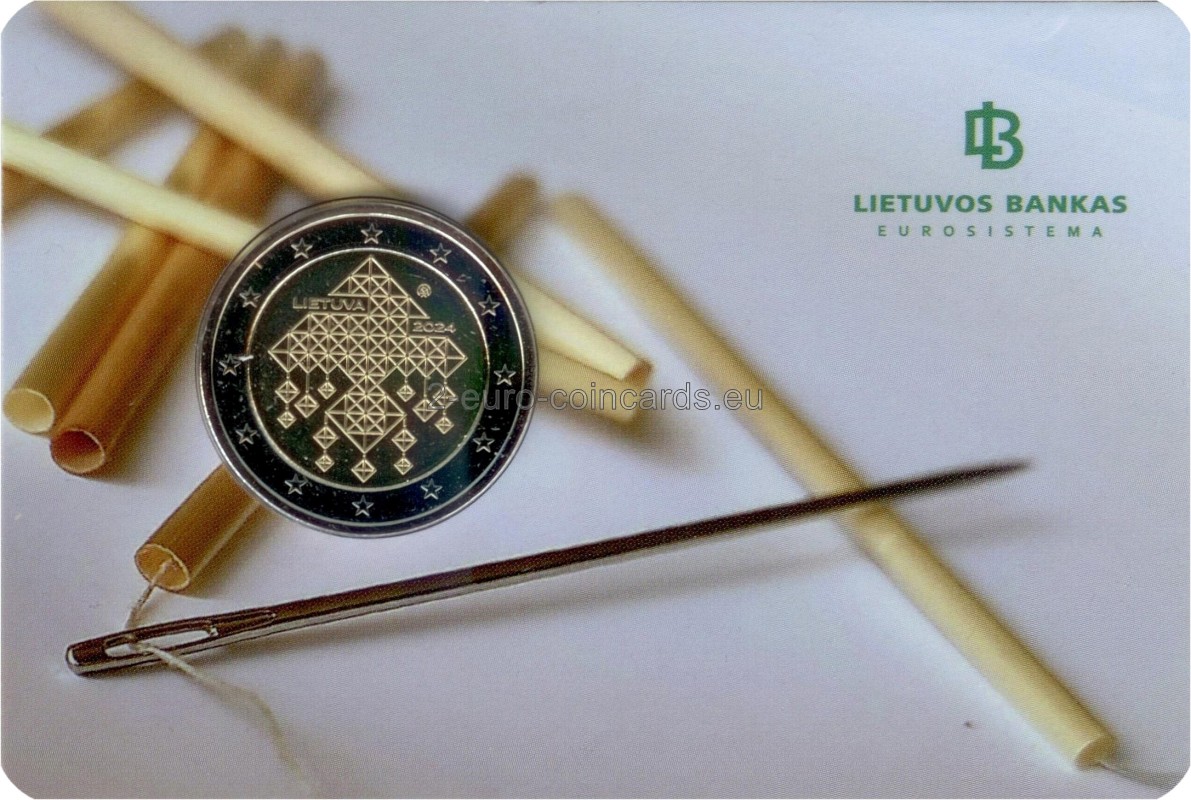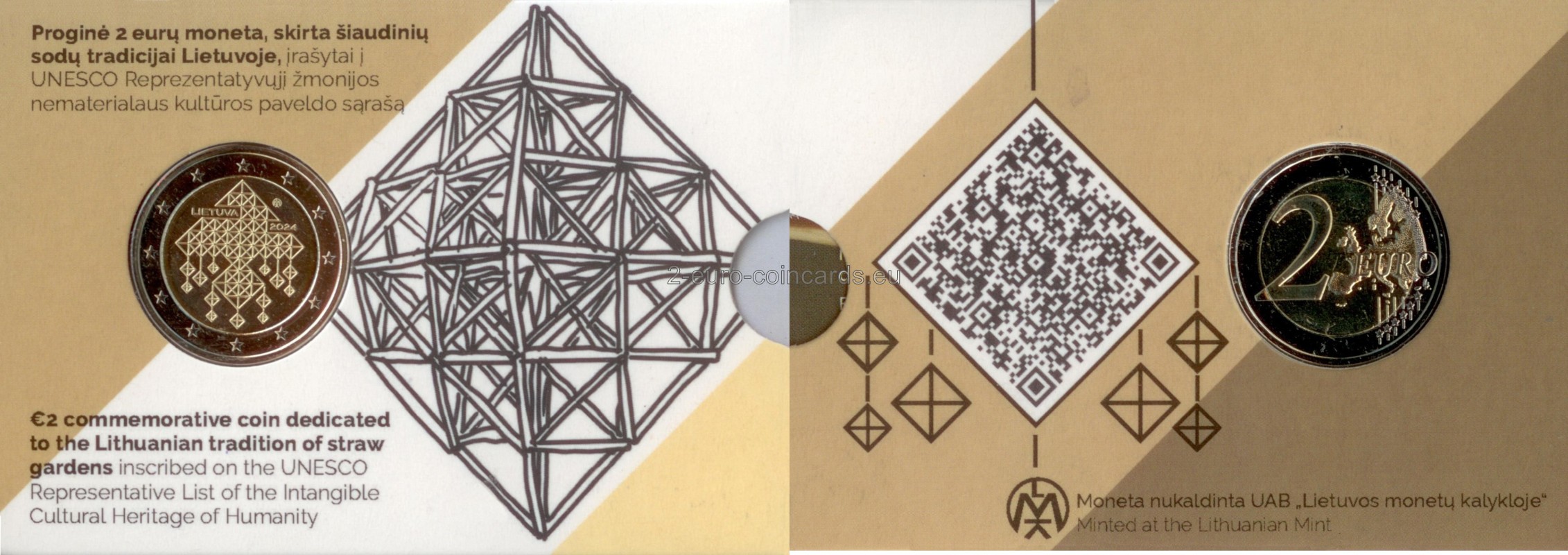 Pamätná minca je venovaná litovskej tradícii slamených dekorácii, ktorá bola koncom roka 2023 zapísaná do Reprezentatívneho zoznamu nehmotného kultúrneho dedičstva ľudstva UNESCO. Ide o štvrtú litovskú kultúrnu tradíciu, ktorá bola zapísaná do tohto zoznamu UNESCO. Slamené dekorácie sú geometricky tvarované diely vyrobené zo suchej ražnej, pšeničnej slamy alebo iných rastlinných vlákien. Pšeničná slama sa na niť navíja do tvaru trojuholníkov a štvorcov. Tieto geometrické tvary nie sú zvolené svojvoľne. V starovekých kultúrach predstavovali trojuholníky ducha a štvorce hmotu. Práve ich kombinácia vytvára dekoráciu. Slamené dekorácie majú viac symbolických významov. Už dávno je známe, že slamené dekorácie sú veľmi dôležitou súčasťou nášho národa a že slama sprevádza ľudí už od detstva. V minulosti sa slamené dekorácie vešali nad kolísku dieťaťa. Dekorácie sa vyrábali aj pri príprave na veľké sviatky roka - Vianoce a Veľkú noc - a vešali sa na povalu, aby vytvorili sviatočný priestor harmónie, krásy a poriadku okolo stola. Slamené dekorácie sa dávali aj ako svadobný dar pre novovznikajúcu rodinu.
