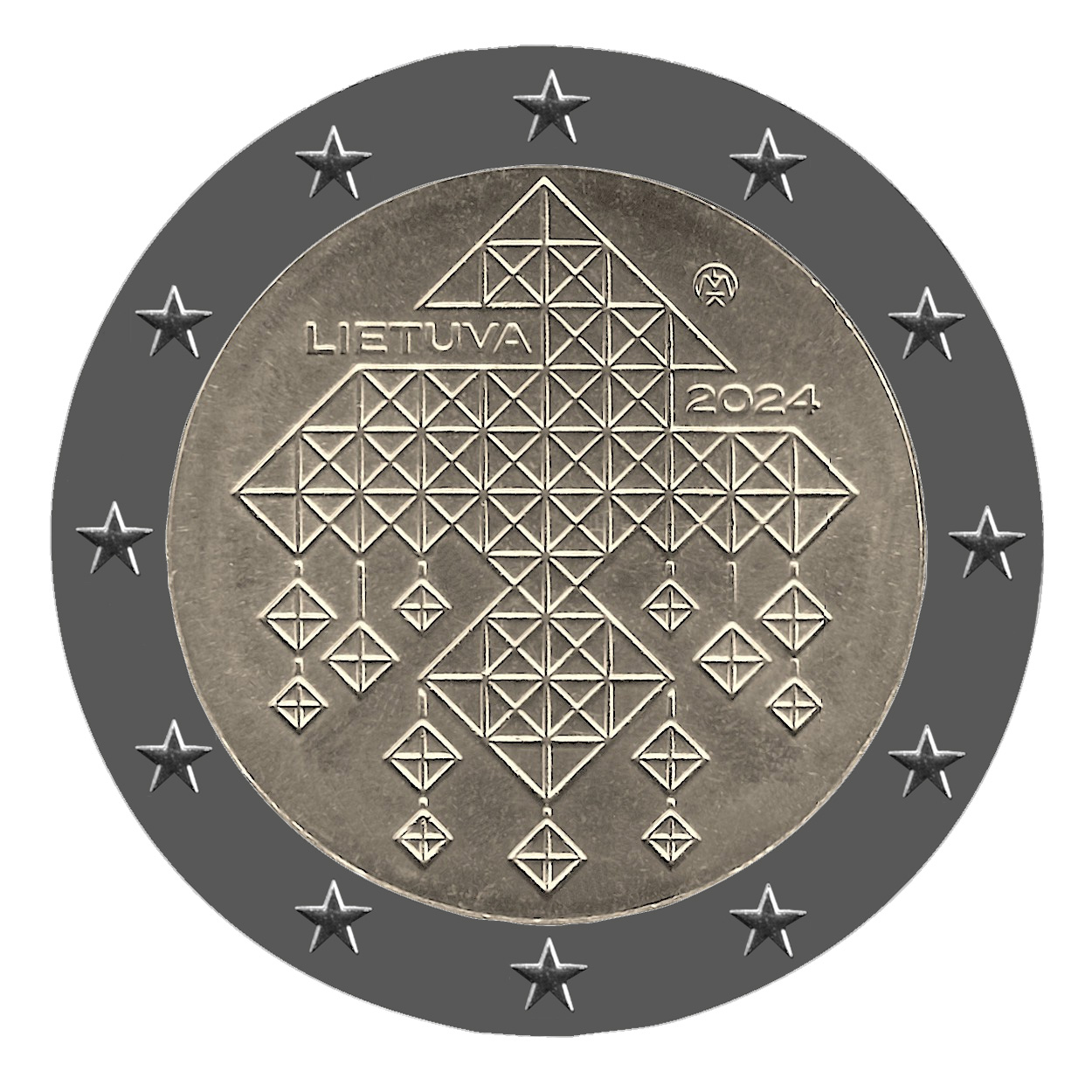 Na minci je štylizovaná slamená dekorácia pozostávajúca z geometrických tvarov rôznych veľkostí, ktorých jeden hrot smeruje nahor (do neba) a druhý nadol (do podzemia). V hornej časti je nápis „LIETUVA“, rok vydania (2024), značka litovskej mincovne.