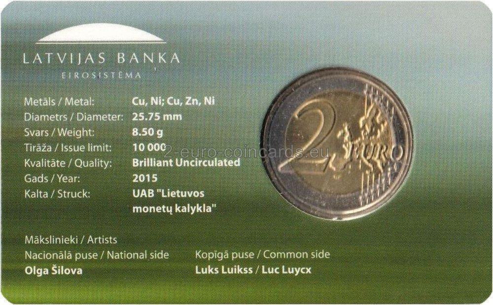 Na vzore je znázornený bocian čierny (Ciconia nigra), ktorý je jedným z druhov považovaných za symboly ochrany prírody v Európe. V dolnej časti vzoru sa nachádza názov vydávajúcej krajiny „LATVIJA“ a pod ním je uvedený rok vydania „2015“.