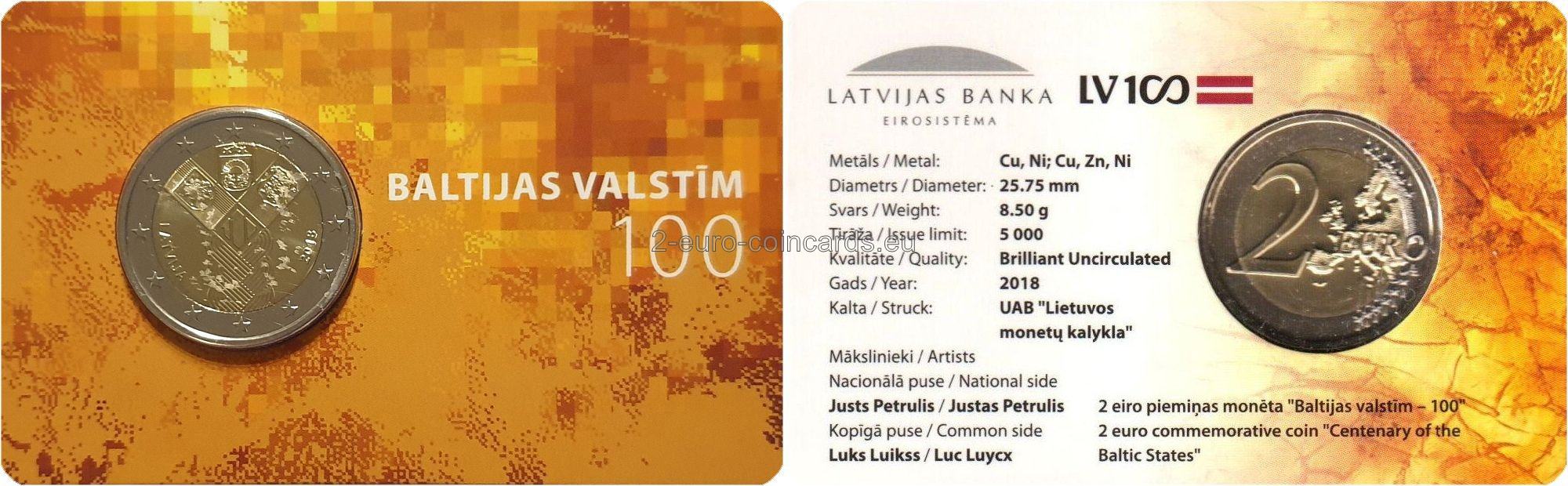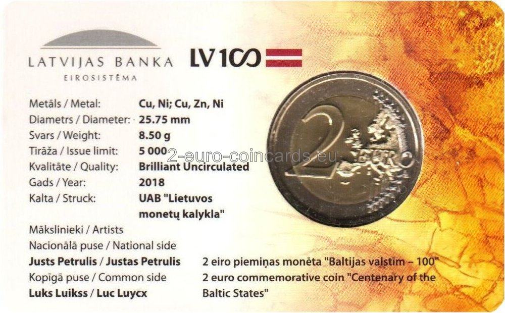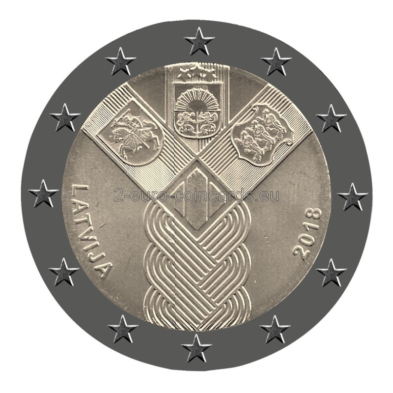 Estónsko, Lotyšsko a Litva v roku 2018 spoločne vydali pamätnú eurovú mincu so spoločným motívom, ktorou sa pripomína vznik estónskeho štátu a lotyšského štátu a obnovenie litovského štátu. Tri pobaltské štáty sú symbolicky znázornené vo forme vrkoča. Spája ich história: spoločná minulosť, súčasnosť a budúcnosť. Súčasťou motívu je aj štylizovaná číslica predstavujúca 100. výročie a heraldické symboly všetkých troch štátov. Na ľavej strane sa nachádza názov vydávajúcej krajiny „LATVIJA“ a značka mincovne, na pravej strane rok vydania „2018“ a značka autora návrhu „JP“. Tento návrh bol vybraný na základe verejného hlasovania vo všetkých troch pobaltských krajinách.