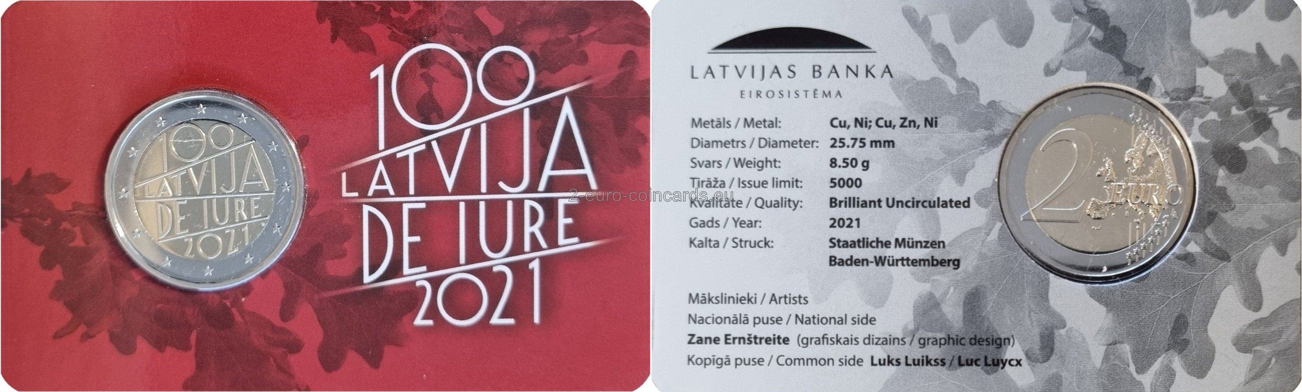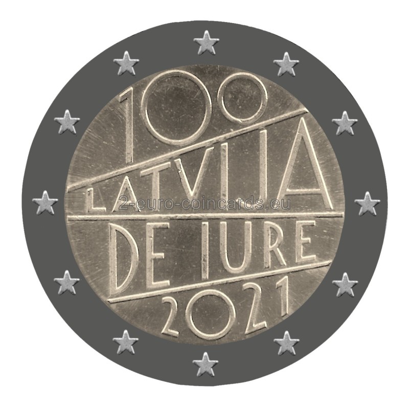 Na vzore sa nachádza umelecký nápis „100 Latvija de iure 2021“, ktorý zahŕňa názov krajiny "LATVIJA" aj rok vydania "2021".
