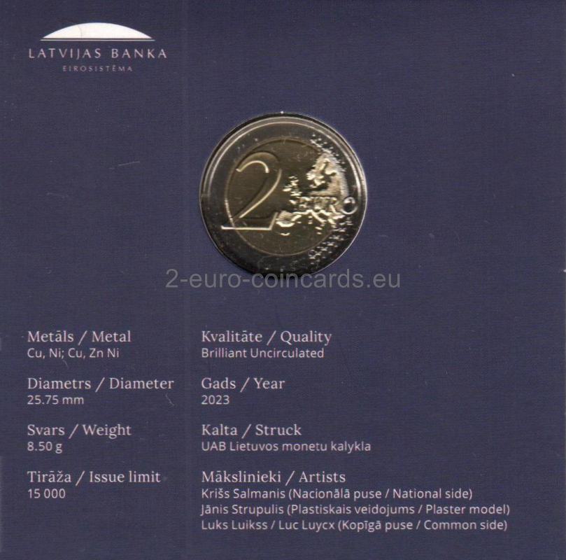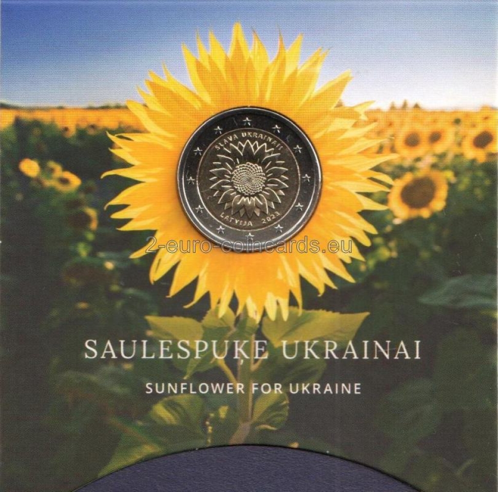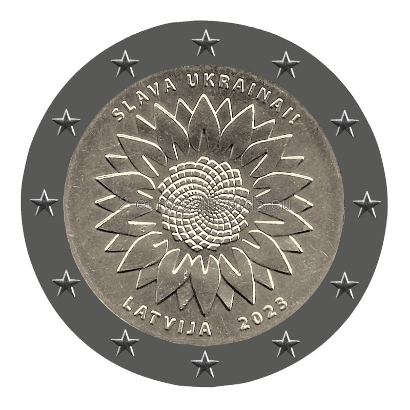 V hornej časti je v polkruhu uvedený nápis „SLAVA UKRAINAI!“ (Sláva Ukrajine) a v dolnej časti v polkruhu sa uvádza názov vydávajúcej krajiny „LATVIJA“ (Lotyšsko), za ktorým nasleduje rok vydania mince „2023“. Autorom návrhu je lotyšský umelec Krišs Salmanis.