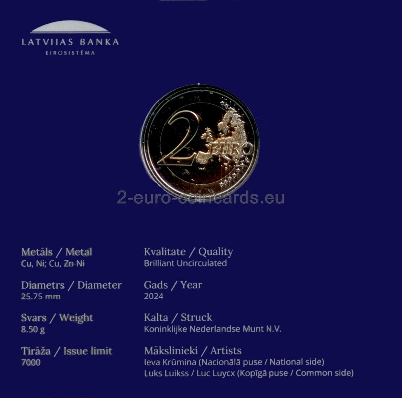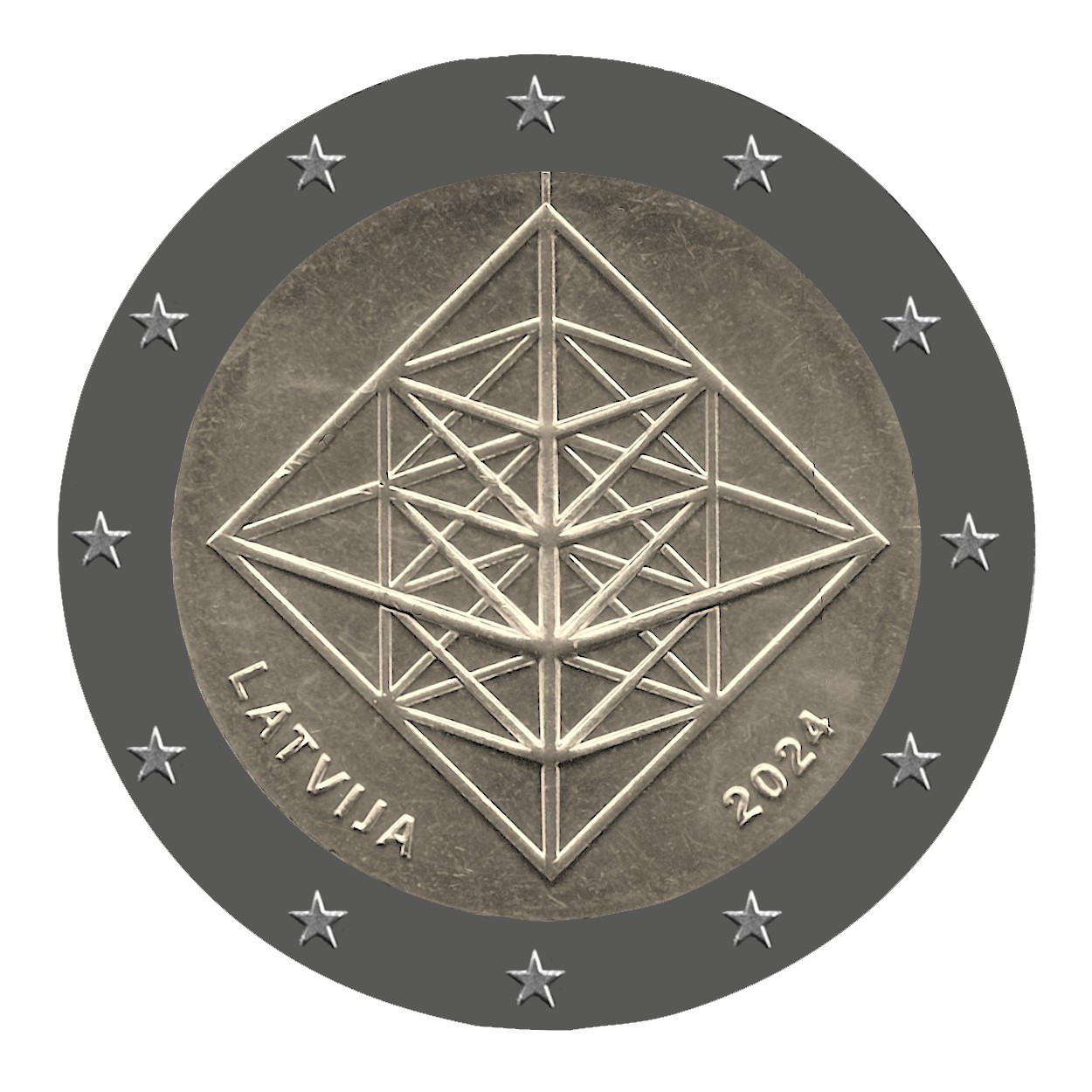 V strede mince sa nachádza dômyselne spracovaná slamená dekorácia v tvare osemstena, ktorý je tvorený 12 spojenými slamkami a symbolizuje rok s 12 mesiacmi; vľavo dole je nápis „LATVIJA“ a vpravo rok vydania „2024“.