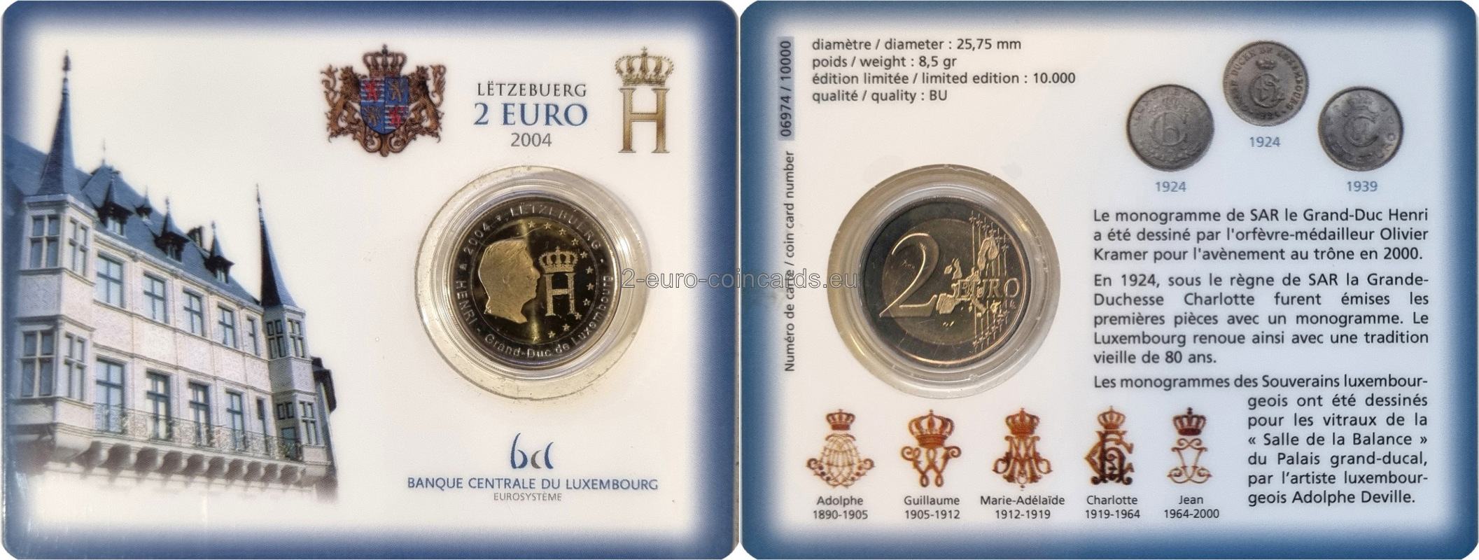 Od roku 2004 vydáva Luxembursko v rámci svojich pamätných mincí numizmatickú sériu "Veľkovojvodská dynastia" venovanú monarchii a rôznym štátnym symbolom. V roku 1924, za vlády veľkovojvodkyne Šarloty, boli v Luxembursku prvýkrát vyrazené mince s osobným monogramom panovníka. Po 80 rokoch bolo rozhodnuté oživiť túto tradíciu na novej minci. Monogram veľkovojvodu Henricha s písmenom "H" a veľkovojvodskou korunou nad ním navrhol zlatník a medailér Olivier Kramer pre korunováciu v roku 2000. Treba poznamenať, že pri razbe mincí v roku 2004 bola použitá špeciálna technológia (hĺbkotlač), ktorá bola pôvodne vyvinutá špeciálne na ochranu papierových bankoviek. Túto technológiu vyvinula Kráľovská holandská mincovňa v spolupráci s rakúskou spoločnosťou "Jura JSP" na ochranu mincí a a nazýva sa "Minted Security Printing". Je založená na mikrotexte vytlačenom na minci pomocou vysoko presného laserového gravírovania. Razba mincí touto technológiou je veľmi výnimočná, pretože takýto druh bezpečnostnej tlače sa v histórii mincovníctva ešte nevyskytol. Monogram veľkovojvodu Henricha je na minci vyobrazený mikrotlačou - šikmým písmenom "H". Ďalšou zvláštnosťou je, že mikrotext na minciach UNC a Proof je sklonený doľava, zatiaľ čo pri minciach BU je sklonený vpravo.