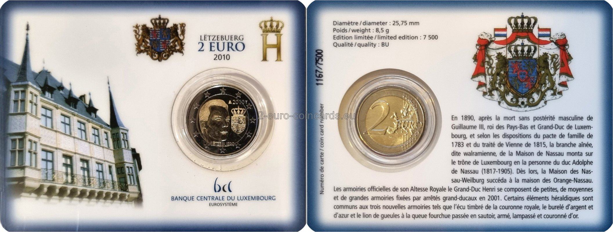 Vo vnútornej časti mince je naľavo znázornený portrét veľkovojvodu Henricha pootočený na pravú stranu. Napravo je znázornený erb veľkovojvodu. Nad erbom je rok vydania mince "2010". Vpravo a vľavo od letopočtu je značka Kráľovskej holandskej mincovne v Utrechte (Merkúrová palica), a jej riaditeľa (Maarten Brouwer, plachetnica). V spodnej časti názov vydávajúceho štátu „LËTZEBUERG“ prekrýva mierne vonkajší obvod.