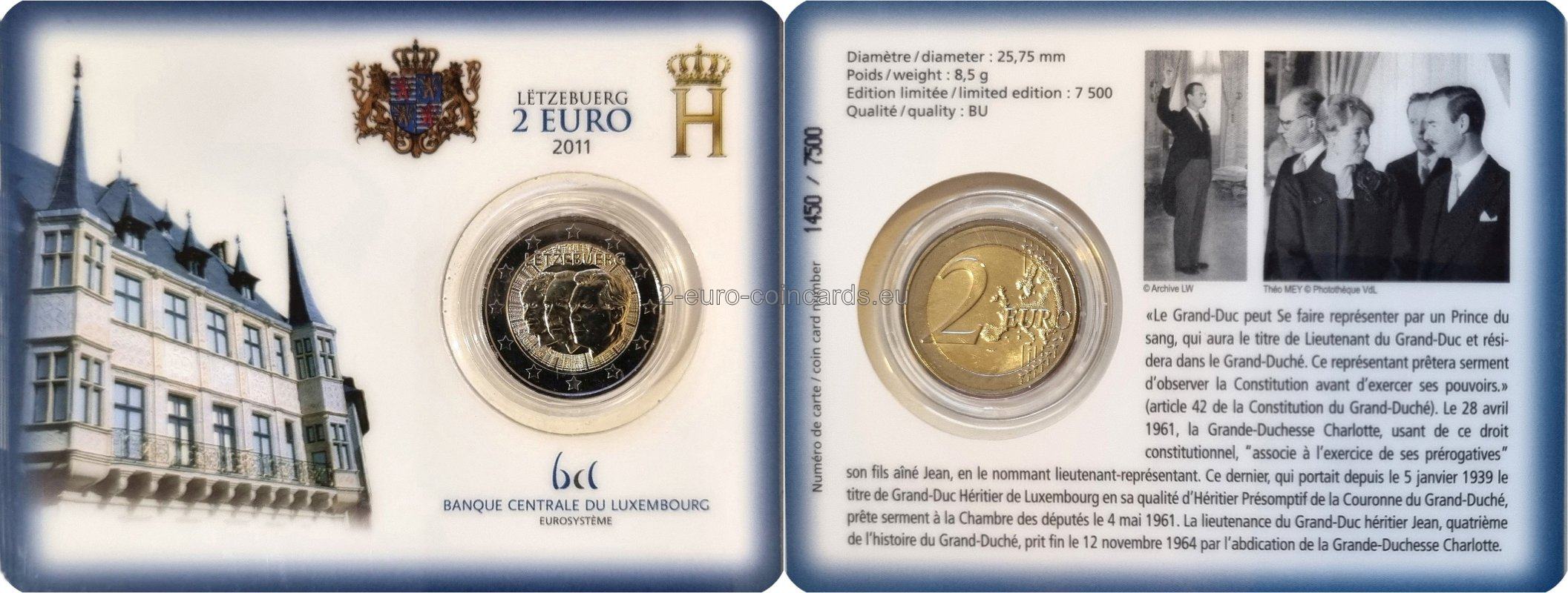 Minca pripomína 50. výročie odo dňa, kedy veľkovojvodkyňa Šarlota vymenovala svojho syna Jána za „lieutenant-représentant“. Na pravej strane vnútorného poľa mince je podobizeň jeho kráľovskej výsosti, veľkovojvodu Henricha, hľadiaceho vľavo, vyobrazená v popredí pred zobrazením veľkovojvodu Jána a veľkovojvodkyne Šarloty. Nad týmito troma podobizňami je nápis „LËTZEBUERG“. V hornej časti sa nachádza letopočet „2011“, po jeho stranách je značka Kráľovskej holandskej mincovne v Utrechte (Merkúrova palica) a značka jej riaditeľa (Maarten Brouwer, plachetnica). Pod príslušnými podobizňami sú uvedené mená kráľovských výsostí: "Henri", "Jean" a "Charlotte". Na okraji centrálneho disku sú mikrotextom vyryté v troch úradných jazykoch - nemčina, francúzština a Luxembursko: "Großherzogtum Luxemburg - Grand-Duché de Luxembourg - Groussherzogtum Lëtzebuerg".