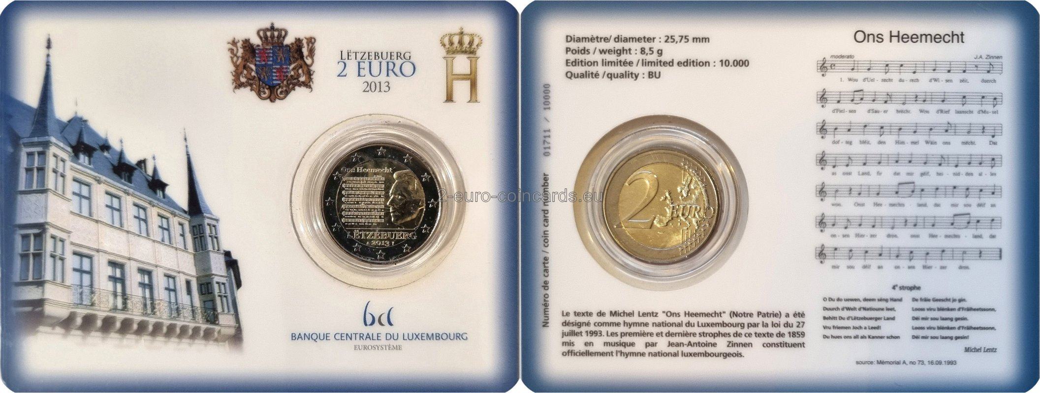 Na pravej strane vnútorného poľa mince je podobizeň Jeho kráľovskej Výsosti veľkovojvodu Henricha hľadiaceho doľava a na ľavej strane je notový záznam spolu s textom národnej hymny. V hornej časti vnútorného poľa mince je názov verša, ktorý sa stal štátnou hymnou veľkovojvodstva „Ons Heemecht“. V spodnej časti je uvedený názov vydávajúcej krajiny „LËTZEBUERG“ a rok „2013“ spolu so značkou Kráľovskej holandskej mincovne v Utrechte (Merkúrova palica) a značkou jej riaditeľa (Maarten Brouwer, plachetnica).